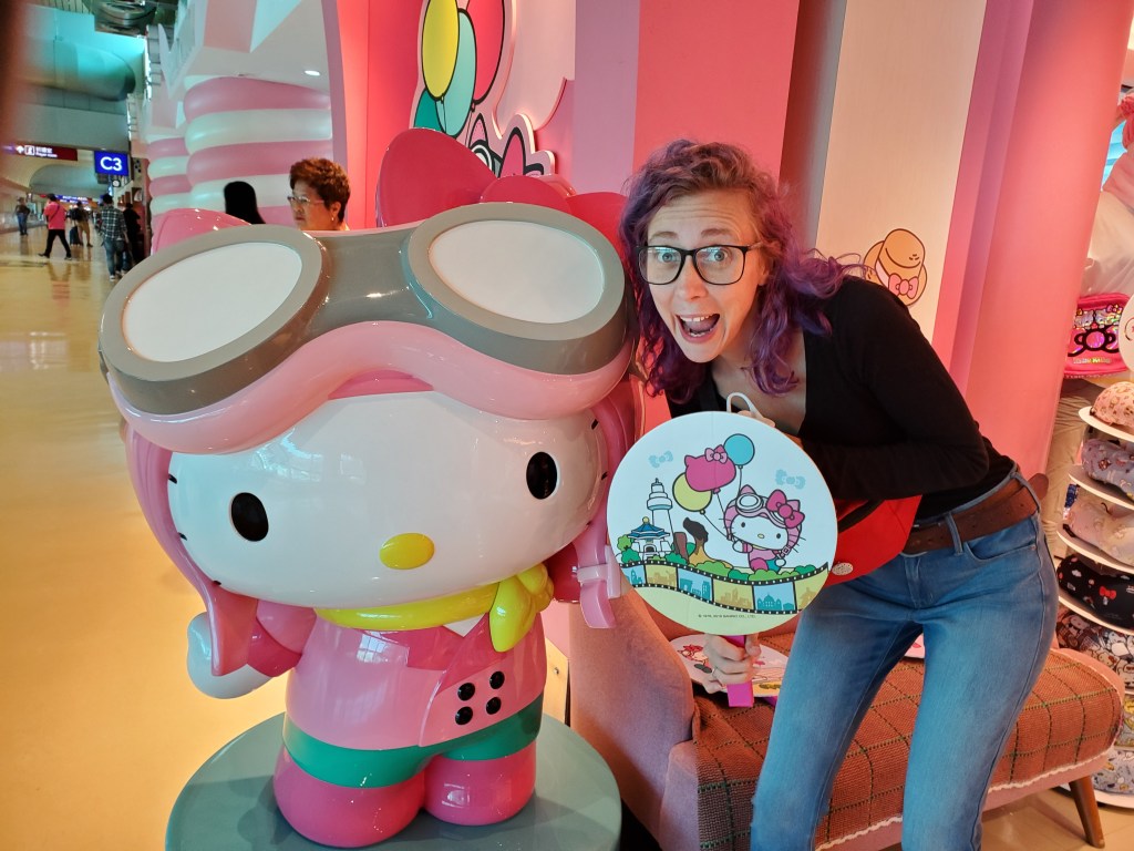 Afterwards we walked the halls, visiting the iconic Hello Kitty gate, and the other themed boarding gates. Our flight was a little late, which scared me because our last layover was in Hong Kong and it was super brief! It all worked out ok though. We were a bit worried because there had been protests at the airport in Hong Kong (little did we know that in 3 months time we’d be back in Hong Kong, terrified of COVID.)