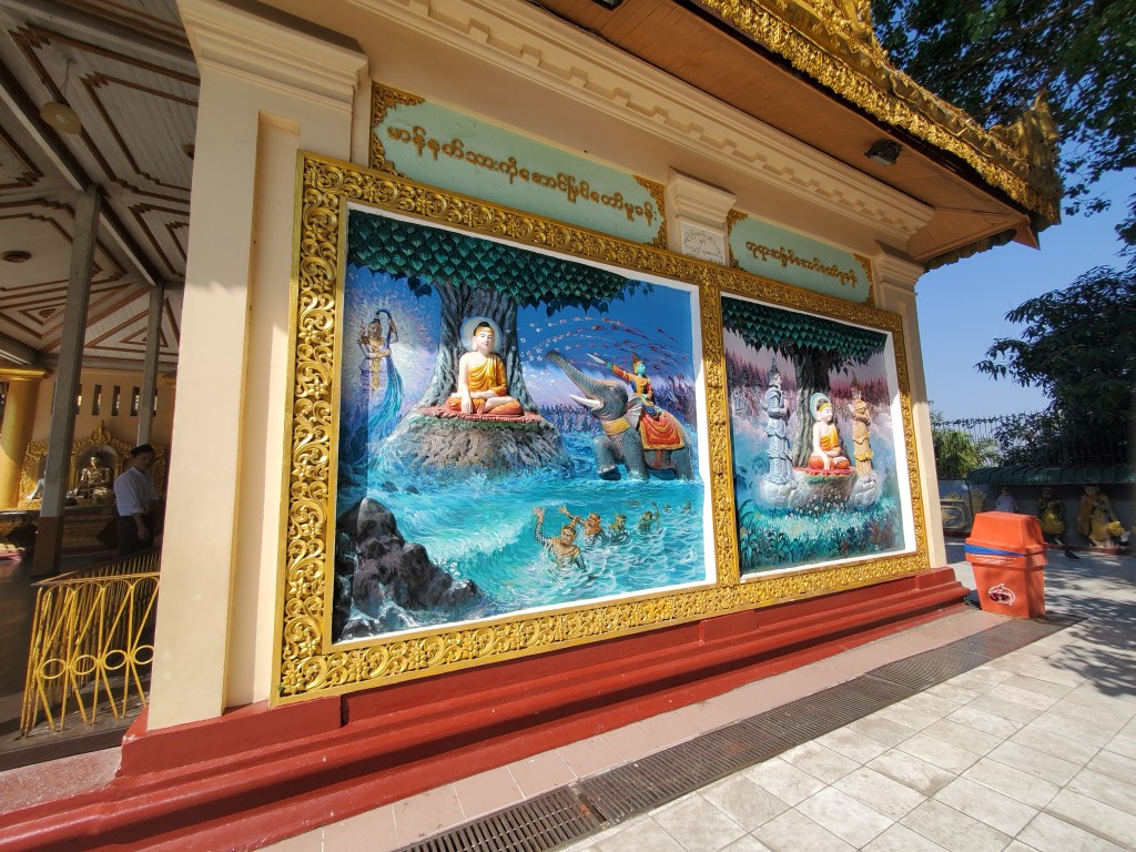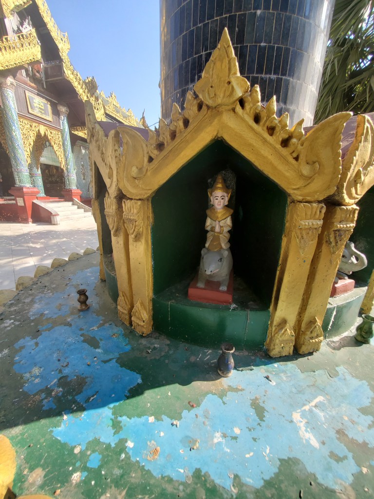 Around the main stupa there are many smaller shrines and figures. At 8 locations dotted around the main pagoda, you will find tiny shrines with days of the week written above them. Mahabote is an ancient branch of Burmese astrology, and much like the Babylonian astrological signs (Aries, Scorpio, Cancer etc.) certain attributes are attached to each sign. Depending on which day of the week you were born, you would visit and offer prayers to the corresponding shrine.