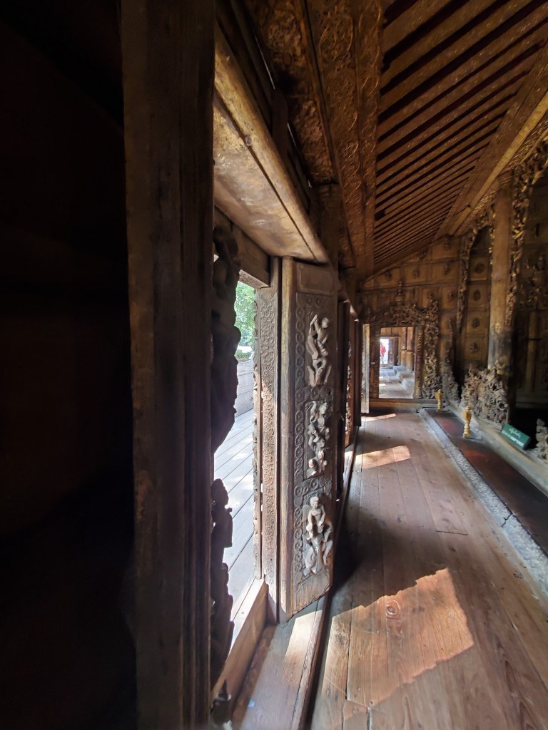 We then walked to the gorgeous old teak monastery Shwe Nan Daw Kyaung. The entire building was covered in elaborate wooden carving, depicting scenes from various Buddhist texts.