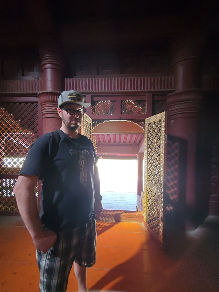 Once you get to the central place, you will be greeted by an amazing towering wooden pagoda, with many elaborate wooden palace structures all around it. We walked to the King’s room first, passing by the Great Audience Hall. The great audience hall is the most elaborate building on the grounds. The building is covered in carved lotus flowers and foliage. The caps on the edge of this tower are meant to represent peacocks, which are the emblem of the royals in Myanmar.