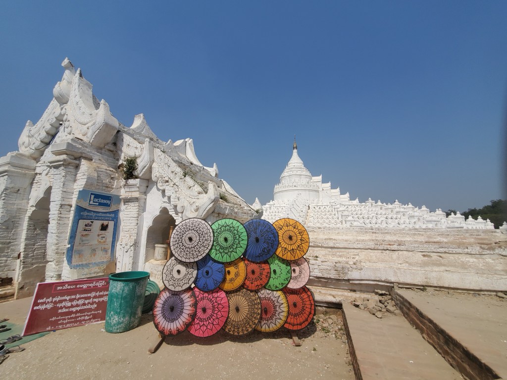 After visiting the Cracked Pagoda or Mingun Paya, we walked the short distance to the White Pagoda, Hsinbyume Paya. Along the walk there are were many shops and stalls selling food, clothing and handy crafts. I bought myself a beautiful lonygi (traditional skirt) from an very friendly (and not pushy at all) elderly lady and her friend. Jives bought himself a t-shirt with the Burmese alphabet on it, as well as a hat to add to his dad’s hat collection.