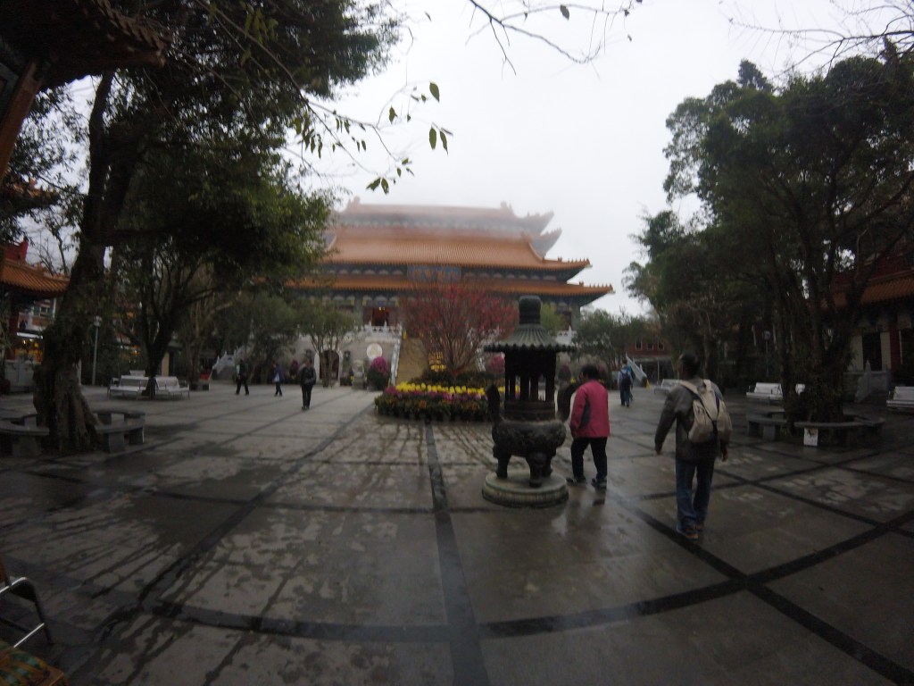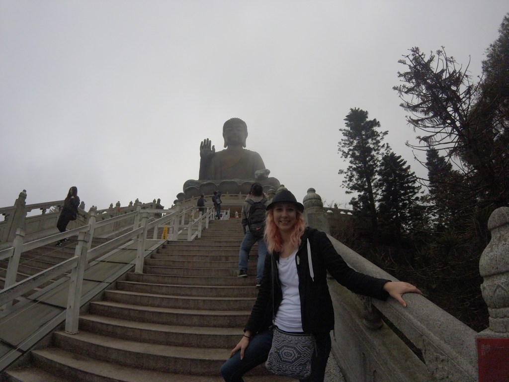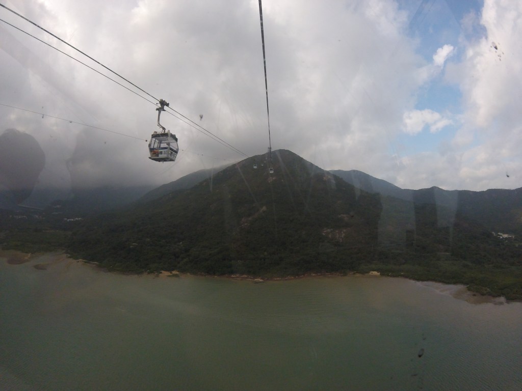 After filling up at Temple Street, jump on the metro at Jordan Station and take the metro to Tung Chung for the Ngong Ping Cable Car to Ngong Ping on Lantau Island. This cable car ride will carry you 5.7km into the clouds of Lantau Island. The ride takes about 25 minutes. Try to book tickets online in advance if you can, otherwise arrive early to get a ride! When we rode the gondola it was extra foggy, and it looked like our gondola was riding off into the abyss.