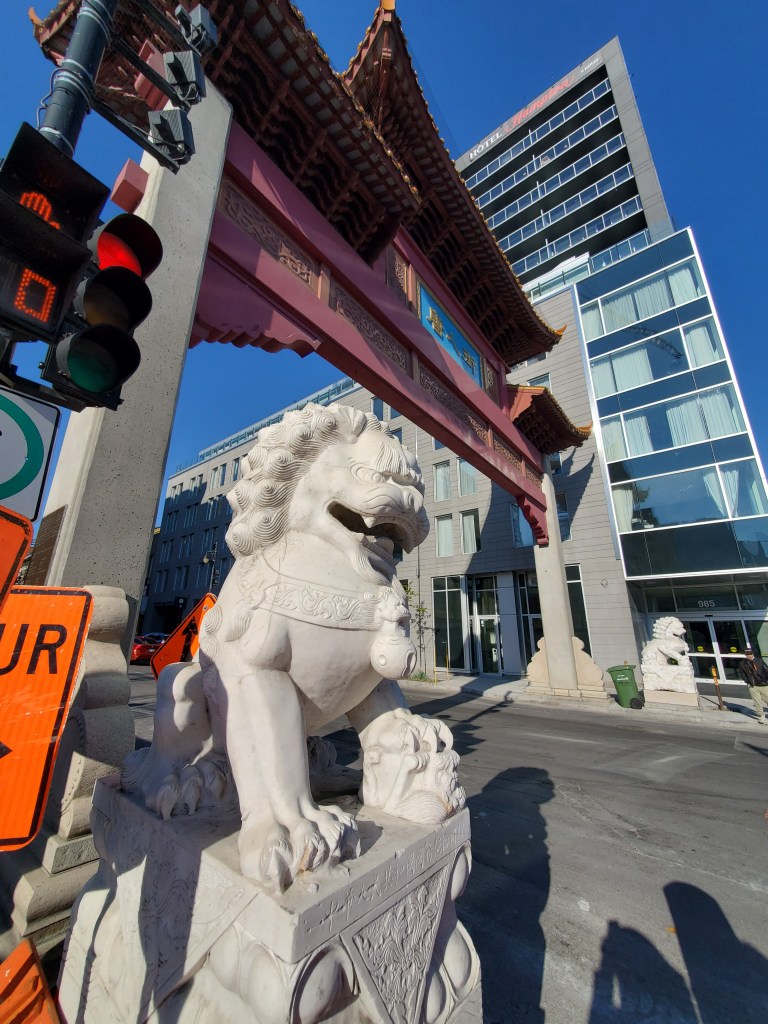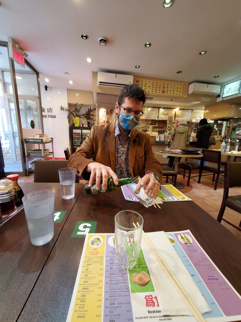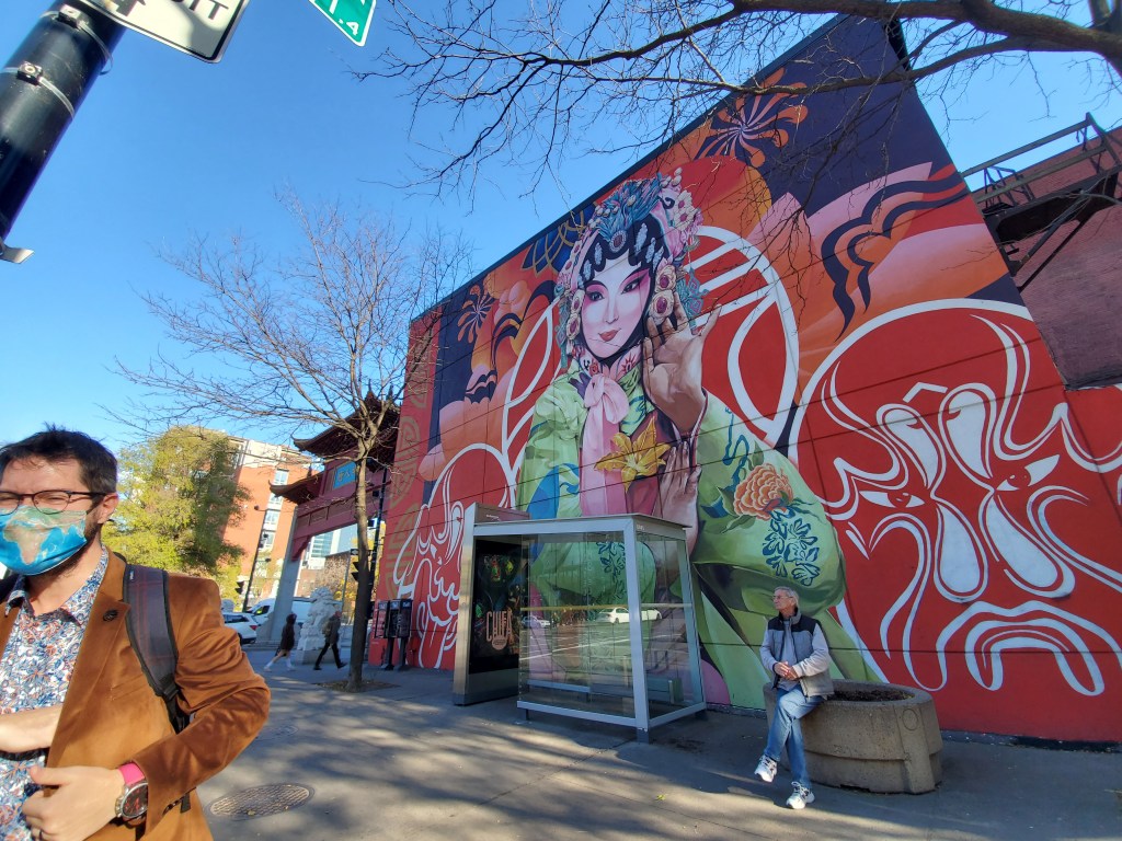 We wandered up St Laurent Boulevard, looking for a place to have lunch. We hadn’t eaten in a restaurant since February 2020, when we had sushi at a restaurant in Hong Kong. It had been twenty two months since we had eaten anywhere but at home, so this felt like a BIG step for us. We chose a little dinner style looking Chinese restaurant and timidly went in. At the door we presented our Ontario vaccine QR code, and the lady scanned it and asked for ID. I felt a lot better that only vaccinated people were in this restaurant. We sat down at a little booth, and took in our surroundings, it felt so good to be traveling again!
