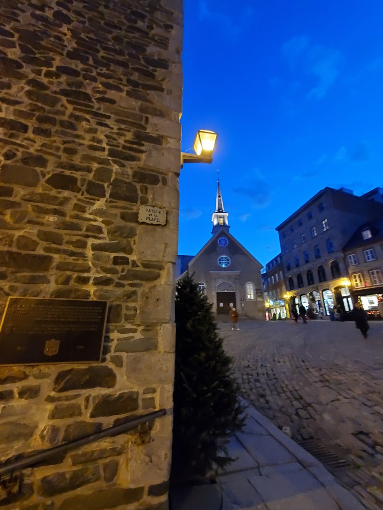 We then made our way back down the breakneck stairs and into Lower Quebec City. Here we visited the Place Royal, the oldest town square in Quebec. The hour meant that we had the entire square to ourselves, so we sat and enjoyed the scenery and the still night.