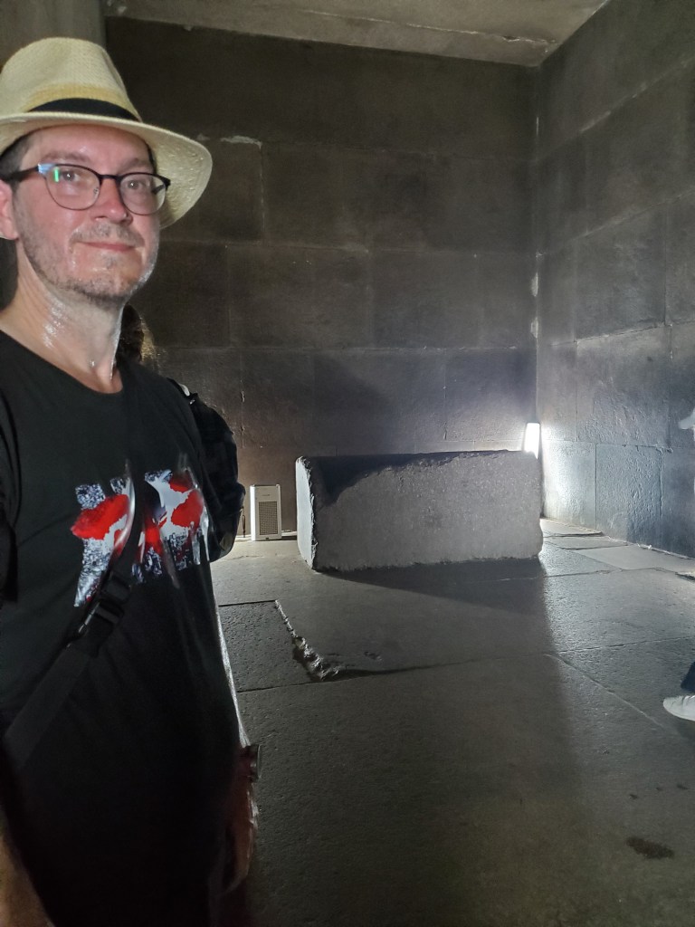We then went into the Great Pyramid, something I never thought I’d do! To get into the pyramid you first climb up a few rows of the pyramid bricks and enter about 12 feet above ground level. We showed our ticket to the entrance guard and went in. The tunnel initially felt cool and welcoming but it got hot quickly! The second tunnel, the one that leads to the burial chamber was half my (Holly- 5’7” Jives 6’5”) height and you climb it at a 45 degree angle hunched over. Once you hold this painful pose and climb for about 5 minutes, you arrive in a tunnel with welcomingly high ceilings. After climbing in relative comfort for another 5 minutes you crouch down again under a very low doorway that felt very Indiana on the way to the grail (only the penitent man shall pass), and then you are in.