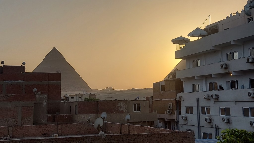 We had a snack lunch on our balcony and filmed the sunset over the pyramids in the distance.