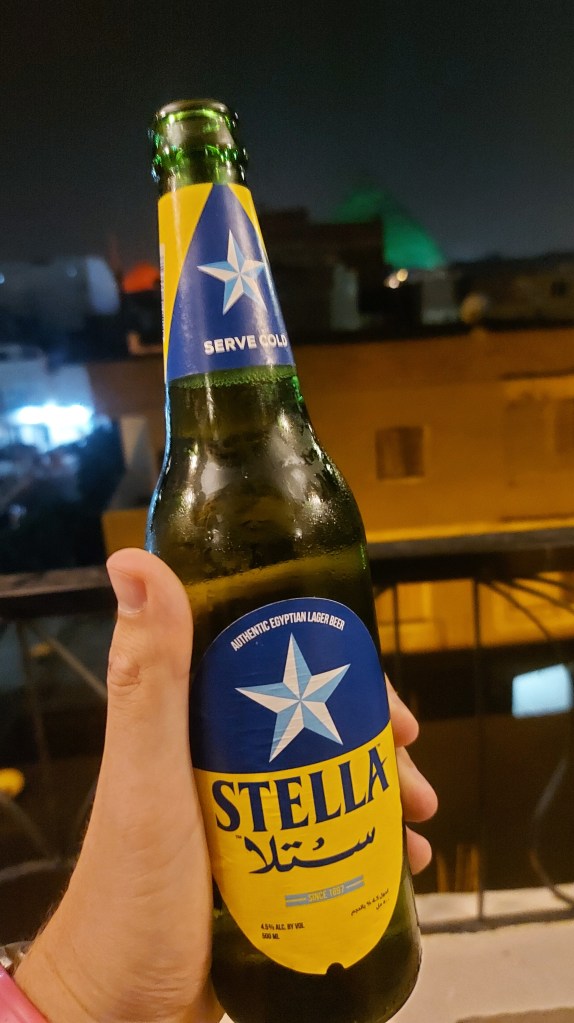 The alcohol shop was a small shop with an ordering window on the front. We bought four bottles of Stella (Egyptian Stella of no relation to the Stella Artois) and it cost 120 Egyptian pounds or about $8 Canadian, but the beers were HUGE!