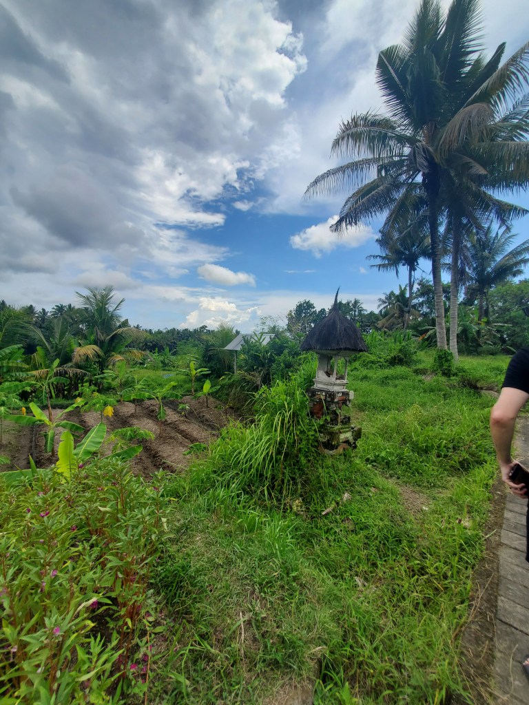 The two hour walk to Goa Gajah Temple was incredible, along tiny rows no wider than 6 inches in places, and with wild flowers, cows and ducks along the way. As we walked through the fields a storm cloud started following us, bringing a cool breeze but somewhat menacing thunder… Just as we were making our way back on to the main road, the rain hit HARD! We took refuge in a corner store and had apple tea and spicy chips. We sat outside the shop for about 30 minutes then decided to purchase an umbrella and set off down the road to Goa Gajah again. We next stopped at a restaurant and had a meal and a beer. Jives had a dish of rice wrapped in a banana leaf and I had Goreng again. We shared two beers and then set off for the final stretch of the walk to Goa Gajah.