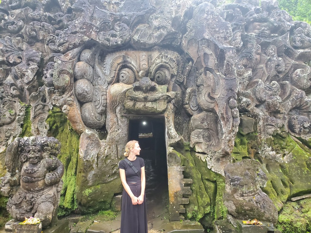 We saw a waterfall along the way (Skcript) and then crossed the road to enter Goa Gajah. We paid 100,000 each ($10 Cad) and then went to enter the temple. Jives had to put on a sarong and sash, I was wearing a long skirt so I was told I was alright to enter.