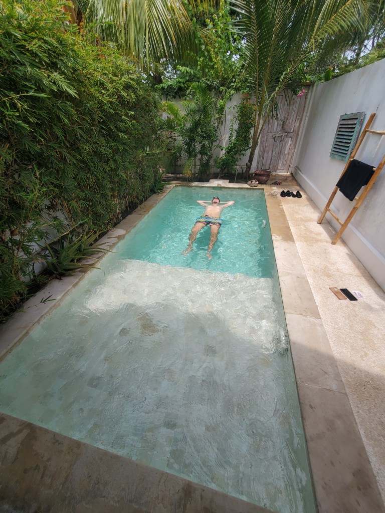 We walked back to the hotel to cool down and have lunch and that’s when the really sad stuff happened. Jives jumped in the pool, but with his phone in his pocket. The phone was toast, like soooo dead. He plugged it in later to try and charge it and set the charger and port on fire. Understandably Jives was pretty sad for a while after that. We walked to a place to have lunch. I had a fish curry and Jives had Gado Gado, a dish with peanut sauce, his meal was much better. There was a super rude customer behind us and another super rude mother daughter combo came in a bit later. It’s difficult to enjoy a meal when other tourists are loudly complaining and acting like the staff is stupid. I really don’t understand tourists like this. The meal was ok, but the restaurant played Nickelback the whole time we were eating (the waiter was singing along which was adorable)… not the best experience. As we left the restaurant a cat jumped on the table to finish all the scraps!