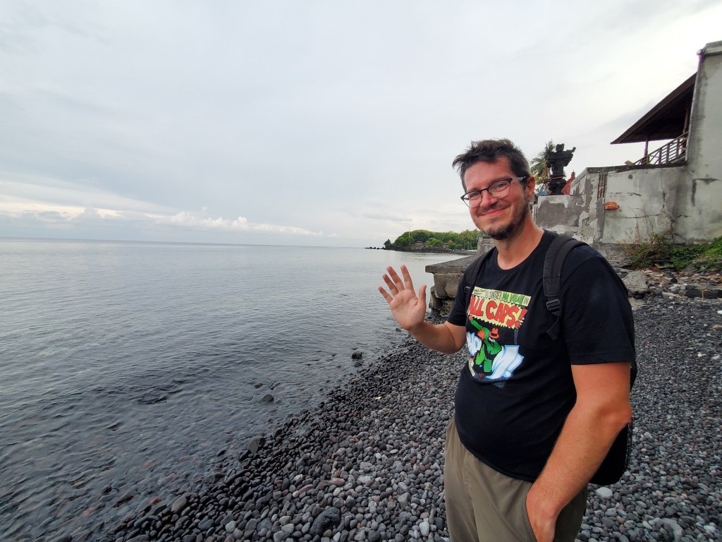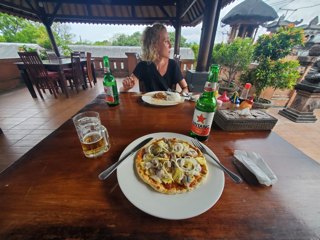 After getting settled in our room, we walked just down the street a little to a shop where we bought some band-aids, nail trimmers, beer, coffee for the morning and some snacks.. you know, the essentials. We then walked to a little restaurant with a rooftop seating area and had some early dinner. Jives ordered pizza with fish, pineapple, mushrooms and onion and I had a tempe satay with rice and a delicious peanut butter satay sauce.