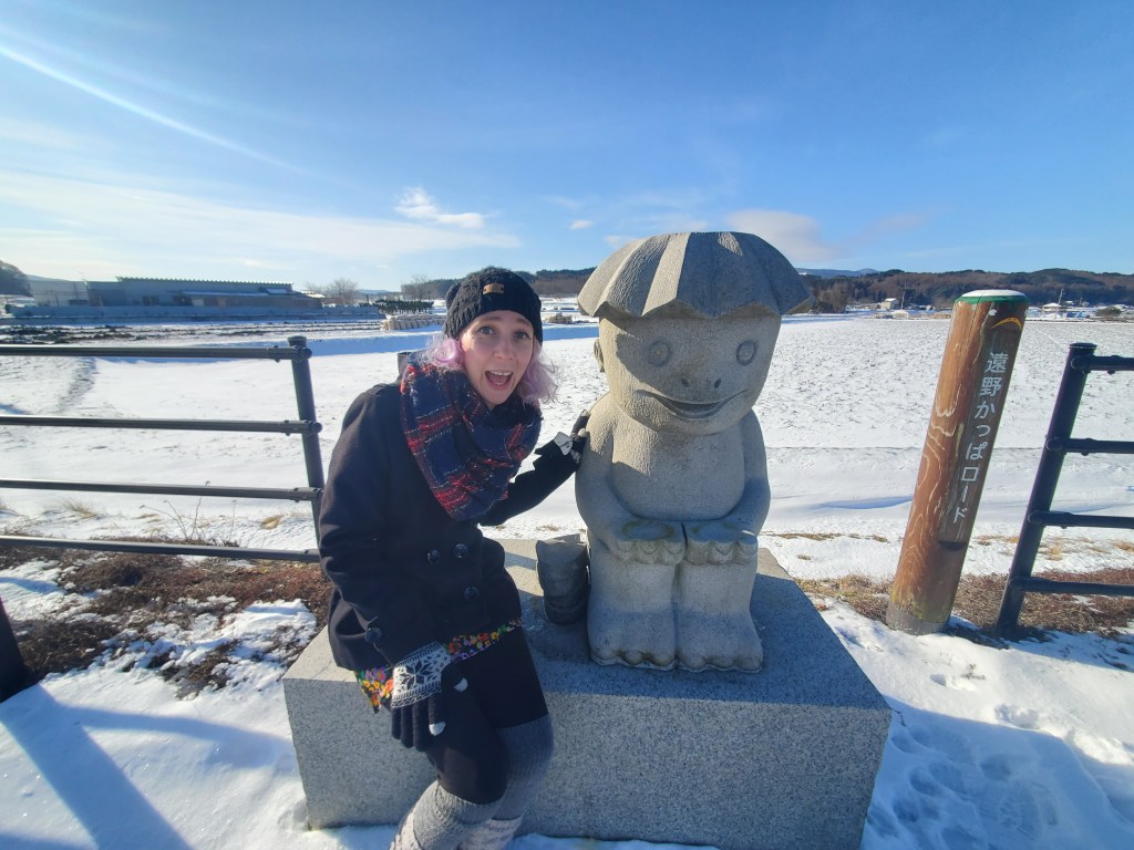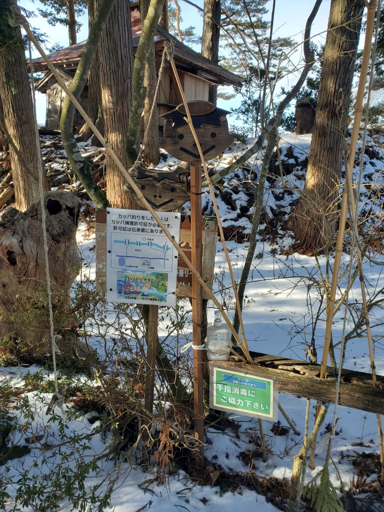 Next we headed to the Kappa fishing hole. We walked along the snowy pathway, along a stream, arriving at the kappa fishing hole. There were more kappa statues and a tiny shrine with lots of kappa characters in it, clearly belonging to a kappa loving man who had passed away. There were fishing rods you could borrow to fish for kappa, but it was BYOC, bring your own cucumber. Just past the fishing spot there was a shrine and a little bridge, it was a very picturesque area.