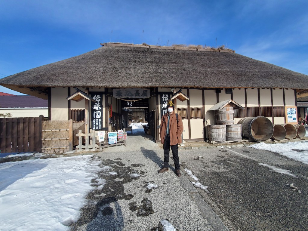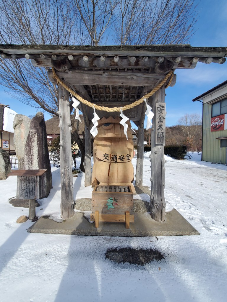 After visiting the snow covered shrine, we stopped in at the only little shop in town. The shop was pretty small and sold canned goods, beverages and some snacks. We hadn’t really eaten in 24 hours, so we bought some buns with jam in them, chips and hot coffee to warm up with. We ate the food just outside the store before heading to Denshoen, a little traditional village next door to the shop. There was a huge wooden statue of a kappa out front of the entrance and gift shop.