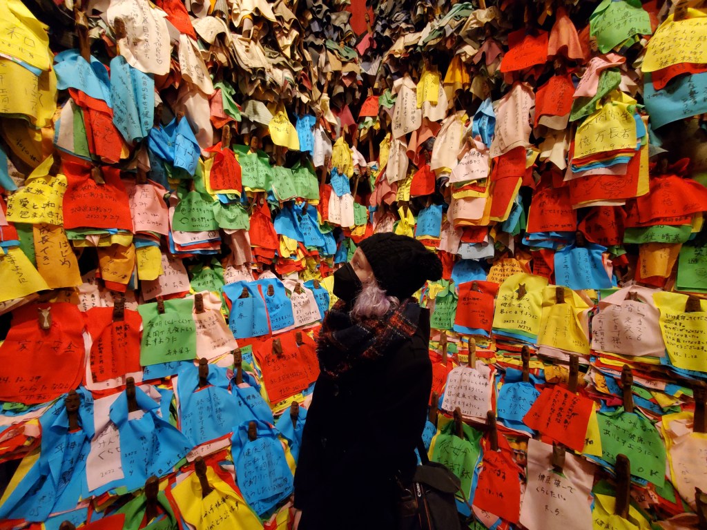 A young girl living in Tono had a horse that she loved very much, the father killed the horse (reasons vary) and hung the body from a mulberry tree. The young girl was upset at the loss of the horse and clung on to the body as it went up to heaven. Oshirasama is depicted as a mulberry branch with the head of a horse carved into one end. There is a mulberry tree at the centre of the shrine as well. Mulberry trees are very important to silkworm/silk production, so the shrine is important to farmers. You can write wishes down on colourful pieces of cloth and place them on the mulberry pegs shaped like horses.