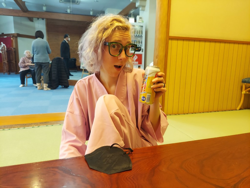 We went down to have a bath in the onsen to warm up after our long cold walk. The onsen was very full. I had to wait to use the shower station (that you use before getting in the bath). When I finally got a station to shower at, the lady next to me sprayed me directly in the face. I sat in the water for 20 minutes or so, with 15 other people (and kids splashing around). I got out of the onsen and had to wait again for a bathing station to rinse off. A little old lady let me use her bathing station. People tend to leave their personal items at the stations when they are in the bath… so the stations aren’t really occupied, just claimed by toiletries etc. being placed there. If you would have told a younger me that I would be sitting naked next to an elderly Japanese woman, scrubbing myself and sitting on a tiny plastic stool, I wouldn’t have believed you. In all honesty you don’t have time to feel uncomfortable being naked with strangers, there is a lot going on in a public bath. I met Jives outside the bath area in the common room and we had a small kirin together from the vending machine as kids played ping pong. A young boy got hit in the face by a ball..