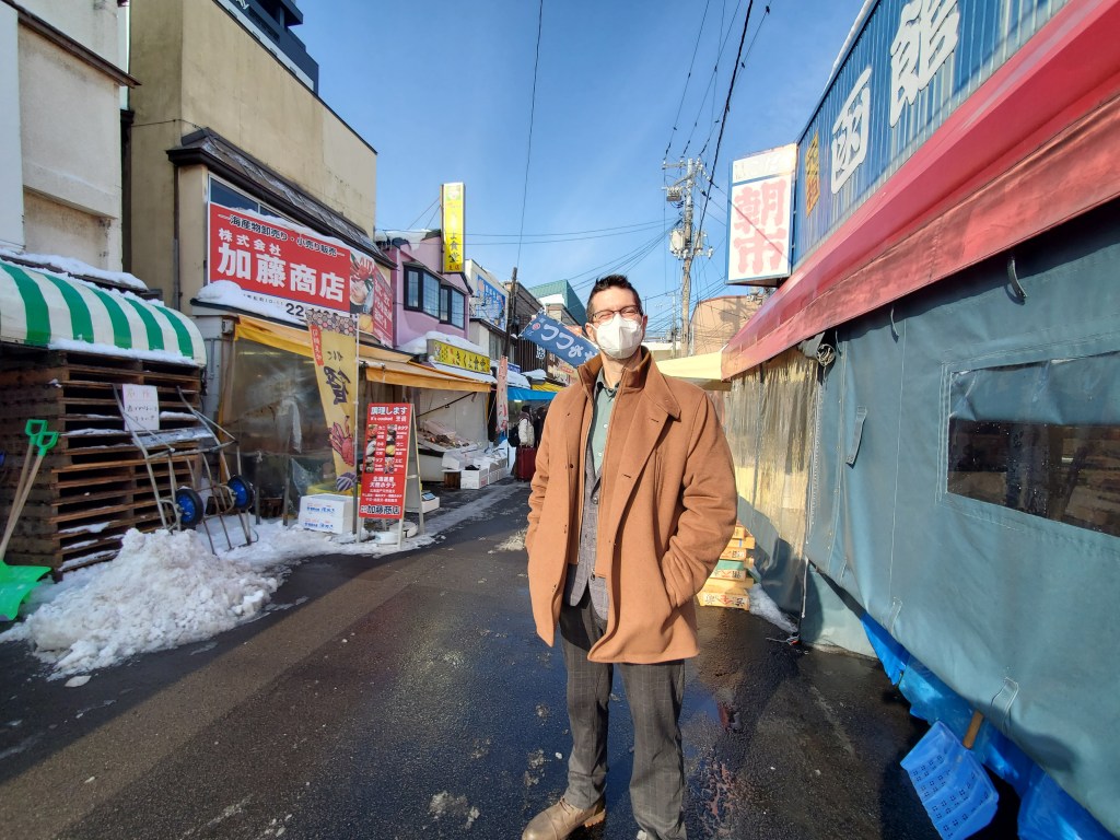 At 9:00am we checked out and headed to the train station (we took the street car) to store our bags for the day. I really loved the streetcar system in Hakodate , it reminded me a lot of Hiroshima’s street car system. After stashing our bags at the train station (for 700 yen or $7) we headed to the narrow streets of the morning market only a few minutes walk away. We wandered around looking at fish, crabs etc and then we bought some fresh scallops to try. The scallops were so smoky and flakey (150 Yen).