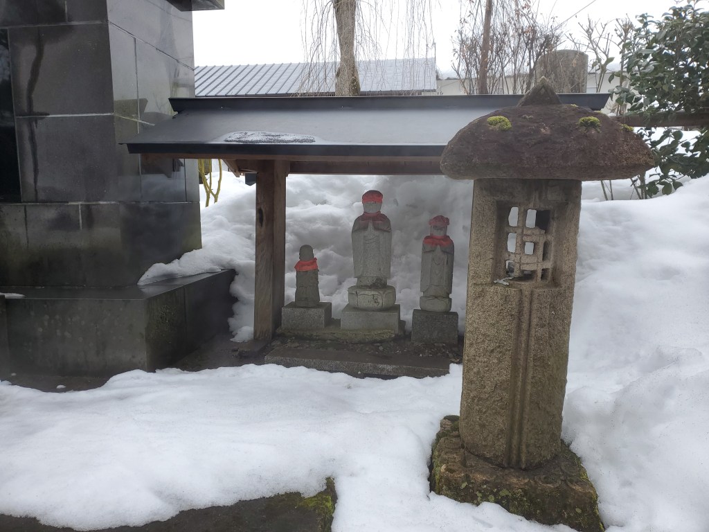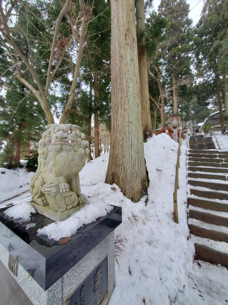 The steam was giving the shrine a very mystical feel. We continued down the street and found the shrine that we were looking for, Shinmeisha Shrine. The base of the shinto shrine has a grey stone torii gate and then a stairway leading up to the main shrine. There were lion statues at the midway point in the stairway. The stairway was lined with tall spruce trees and cedar, and everything was covering in a thick layer of snow. There was a monument to Kingo Hamada (a fallen samurai) near the top of the temple, on the spot where he died.
