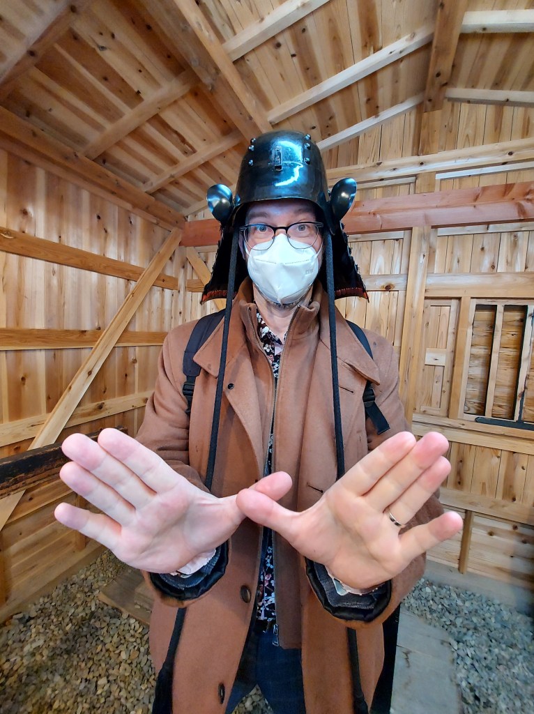 Trying on a Samurai helmet at Aoyagi Samurai house in Kakunodate Akita