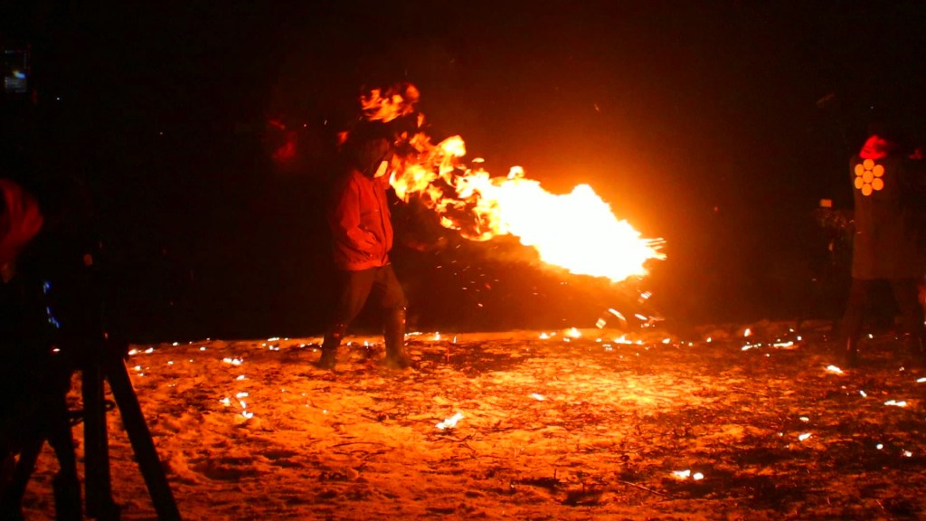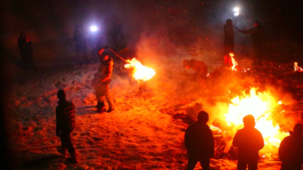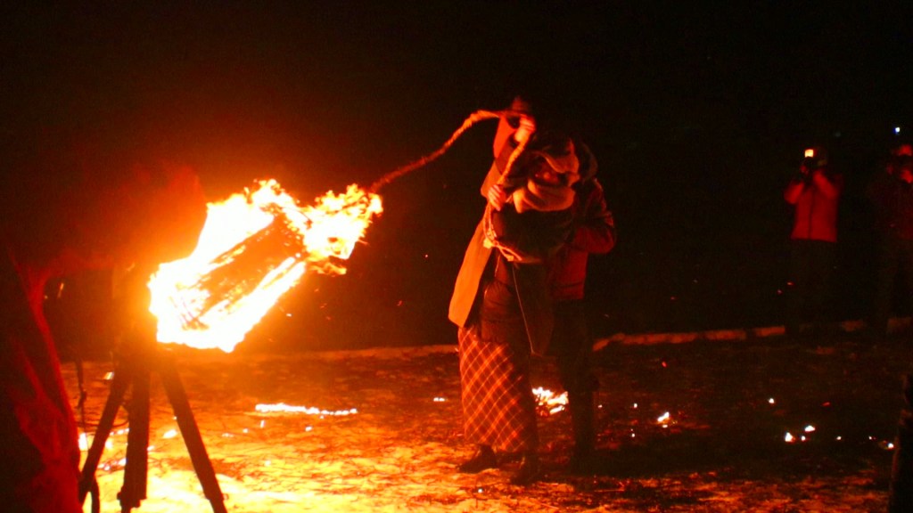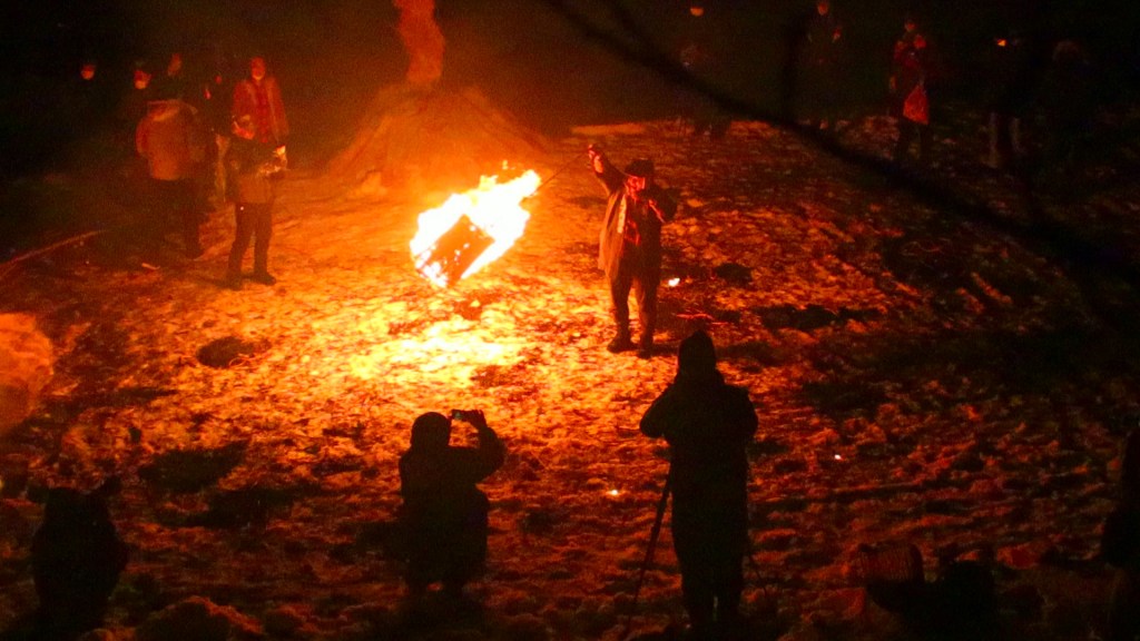 There was a giant fire pit formed in the snow and people were taking turns lighting what I can only describe as baskets made of reeds on a cord (looked a lot like a lobster cage) and then swinging the flaming cages around their heads in circles until the flames crept up the rope and threatened to burn their hands.