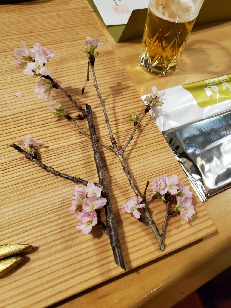 We retreated to our room to have our beer, and stayed there until about 6pm when we headed down to dinner. We were the first to arrive for dinner and we were seated by the river view and waterfall. We told the ryokan that we do not eat meat, but do eat fish, so they had arranged a special meal for us. There were so many dishes; a walnut with a small pick for digging out the nut from the shell, some pickles, little stringy green veggies, an egg custard, sashimi in a leaf pinned with a sakura pin, and a shelled something… They instructed us to put a fish on the little grill which was covered in miso and there was a sort of veggie hotpot. Next they brought us a light coloured fish sashimi and we ate the hotpot with a rice dumpling. The next course was a mushroom soup in a clear broth, which was incredible but so simple. We thought the meal was over so we got up to leave, but the staff told us we had dessert and a green tea coming. Dessert was the juiciest orange, two strawberries and a mochi in a leaf. The server lady let me keep the sakura branch that was decorating my plate (I had said how beautiful it was to her). We also split a beer with dinner.
