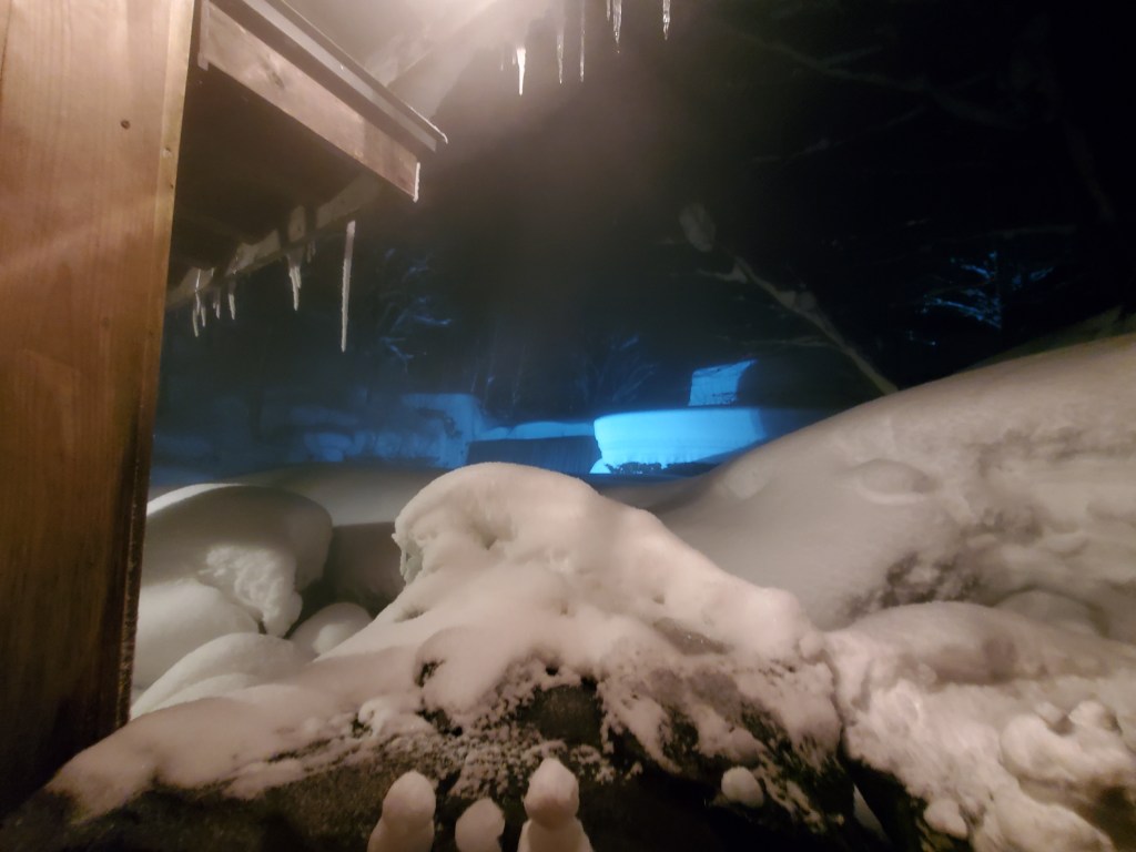 We headed to the private bath at 10pm , walking through the main changeroom for the private onsen. The private bath was right next to the mixed bath and also overlooked the waterfall. We had 30 minutes in the bath, it was super clear and very warm. Jives built a snowman within reach of the bath. It was lovely. We headed back to our room and made a green tea and went to sleep in the futon that had been put out for us as we had had dinner.