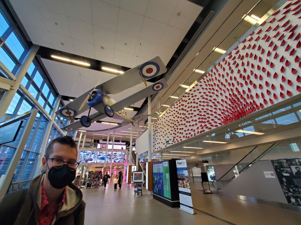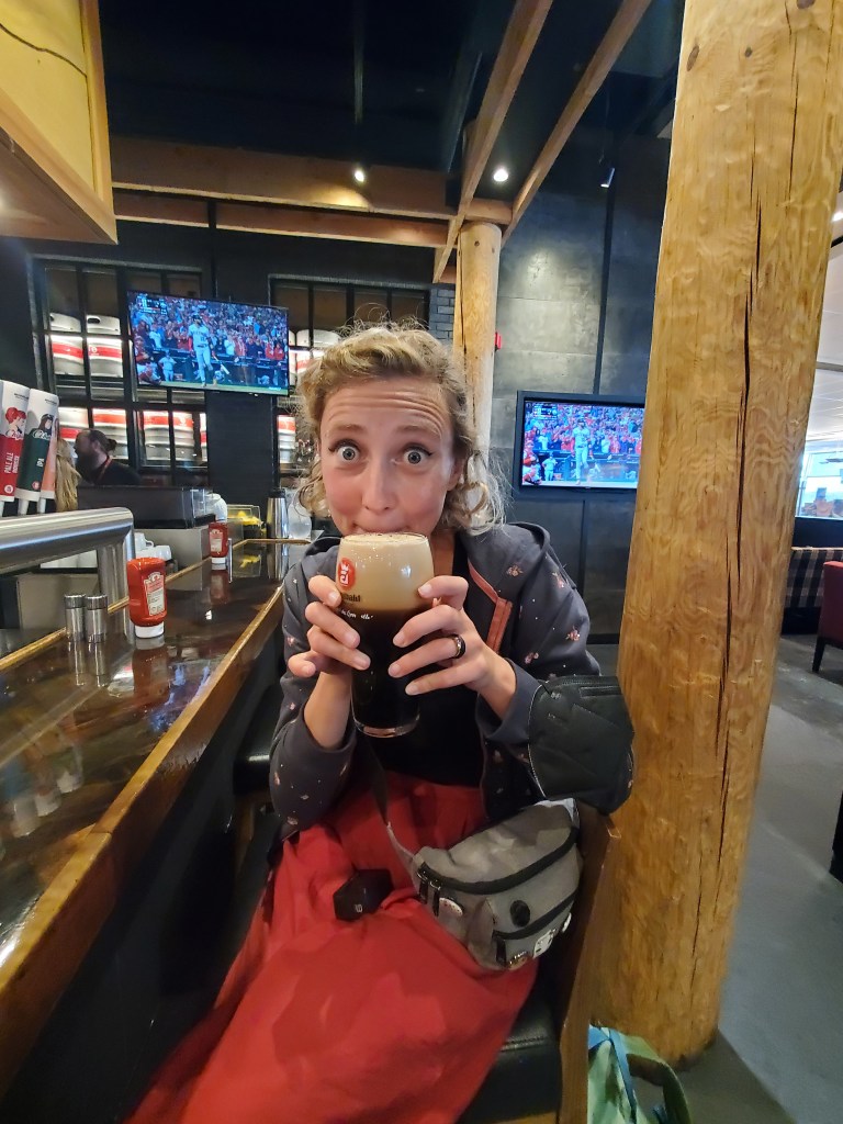 We arrived in Montreal and had a bit under two hours layover. We found a place selling Jives’ favourite “lady beers” and we decided to have a pint before our flight. Jives ordered an IPA with a brunette goggle wearing lady on it and I got a stout with a straight haired brunette. Both were very nice beers. We made our way to our boarding gate, sending Gaby a selfie along the way (for Montreal-Narita nostalgia reasons).