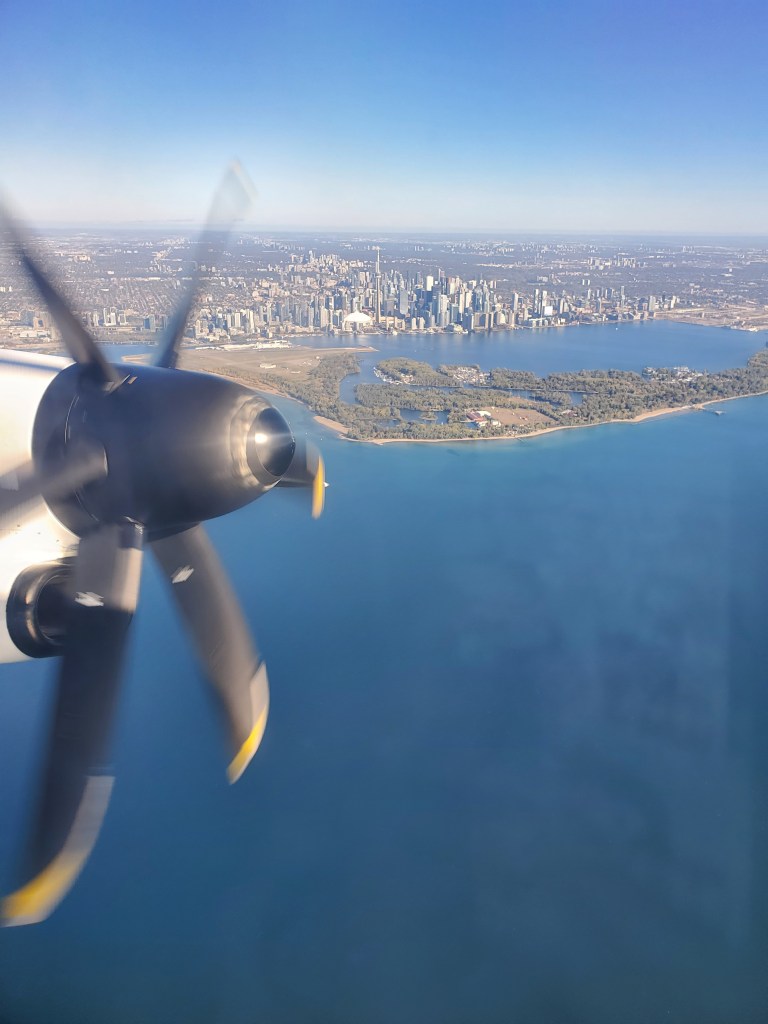 I managed to get a few hours of sleep between work and our 4am wake up call. Our flight was at 10:20am from Toronto’s Billy Bishop airport. We both had never flown from this airport before. My mom was to pick us up at 4:30am to take us to the Burlington GO station, but at 4:45 we hadn’t heard from her. I texted her and then called her.. She thought our flight was at 4:00pm and would be there in 15 minutes! I felt so bad waking her up, and promised to make her tea. Only a few minutes later she arrived at our house. Aren’t moms the best!? I offered to drive her car to the GO station, as I had been awake longer, and I drive there almost every single day for work. We drove to the Burlington GO (no traffic at 5am) and it took about 30 minutes to get there. We had planned to take the 5:28 GO train to Exhibition station, but just missed the train. It was honestly ok, as I am an overplanning borderline obsessive (well not too borderline) and we had loads of time to spare. We took the 5:58am train to Exhibition station. It cost about $10 on our Presto cards for the trip (it’s a few bucks more if you pay without the Presto). As we waited on the platform to board the train, we saw a little fluffy brown bunny in the grass just beside the tracks, right beside us! I named the cutie Waffles. The train took about 50 minutes and we arrived in Toronto just before 7:00am just as the sun was rising right behind the CN tower. Really beautiful. We could have taken the street car to the airport in 15 minutes, but we decided to walk and watch the sun rise, plus we would have had to wait almost 15 minutes until the next street car arrived. The walk was lovely and a bit brisk, maybe 13 celsius or so. There was a tunnel to Billy Bishop and a ferry. The tunnel obviously is more regular than the ferry. The tunnel was uneventful and took maybe 10 minutes. We arrived at the airport, one of the smallest I have ever been to. We used a kiosk to print boarding passes and proceeded to the security line. Security was easy, as the airport is tiny….it took maybe 15 minutes. The security lady put another man’s smokes in my bin, and he pointed this out to me, but I told him the smokes were mine now (a joke)… he didn’t seem to understand. I figured a bearded 30 year old white man might find me funny, nope. We then proceeded to the boarding lounge, it was tiny. We ordered coffee and an egg and cheese ciabatta. We sat and waited almost two hours to board, overplanning for the win! Our flight boarded in like 10 minutes flat, as it was a super tiny plane. Overall Billy Bishop was nice, but lacks the big airport feel. I understand that a small airport is probably most people’s jam, but I love Toronto Pearson (despite all the flaws), driving to it just gets me so excited to travel. I love the international feel, the flights leaving for places all over the world, the nostalgia….am I weird? The flight was a little over an hour (the lovely flight attendant gave Jives and I the only two little Bailey’s bottles for our coffees). It took off and we had a perfect view of the CN tower and the entire skyline of Toronto. It was a perfect cloudless day.