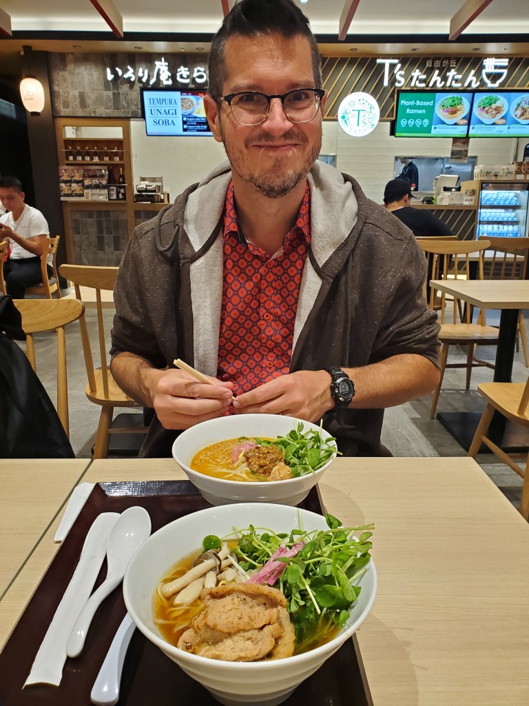 We found a place in the airport to eat (after going through security). We had vegan ramen with delicious imitation pork slices, mushrooms, beansprouts etc. It cost about $22 CAD total for two large bowls. Japan is so reasonable for food, especially given that this was in an airport! We then found our boarding gate. I used my Suica card (Japan transit card) to buy a Pocari sweat from the vending machine. A sweet man helped me with the last step as my Japanese is not great. We boarded the flight at 5:45pm and had the entire back row to ourselves, ANA is an excellent airline. The food was so much better than the usual aeroplane bullshit. Also, the plane was so clean!!! It was a 6.5 hour flight to Singapore. I watched a cute movie about Slughorn walking across the UK (the actor that plays Slughorn in Harry Potter) to cure a lady’s cancer.