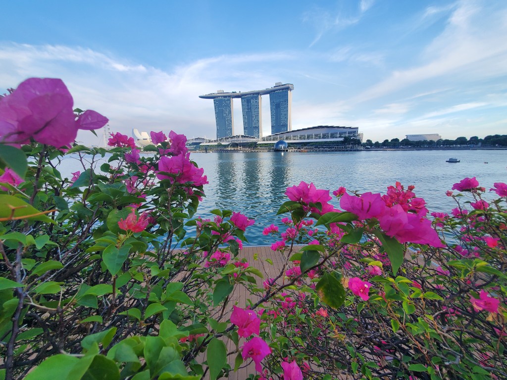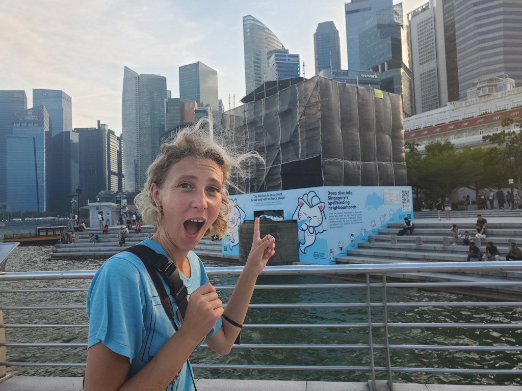 We rested under Shears Avenue Bridge in the shade and saw a very odd sight, a 5 foot plus long lizard thing swimming just feet from us…it looked like a Kamodo dragon… it was terrifying. Some research tells me it was probably a Malayan water monitor. They grow up to 3 metres long. We then walked along the Helix bridge to the Marina Bay Hotel and Art and Science Museum. This museum was surrounded by beautiful purple water lilies. We kept wandering along the water towards the Merlion, happening upon a relay race. The merlion was in a construction box. No merlion viewing for us. Bummer.