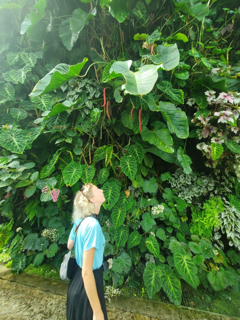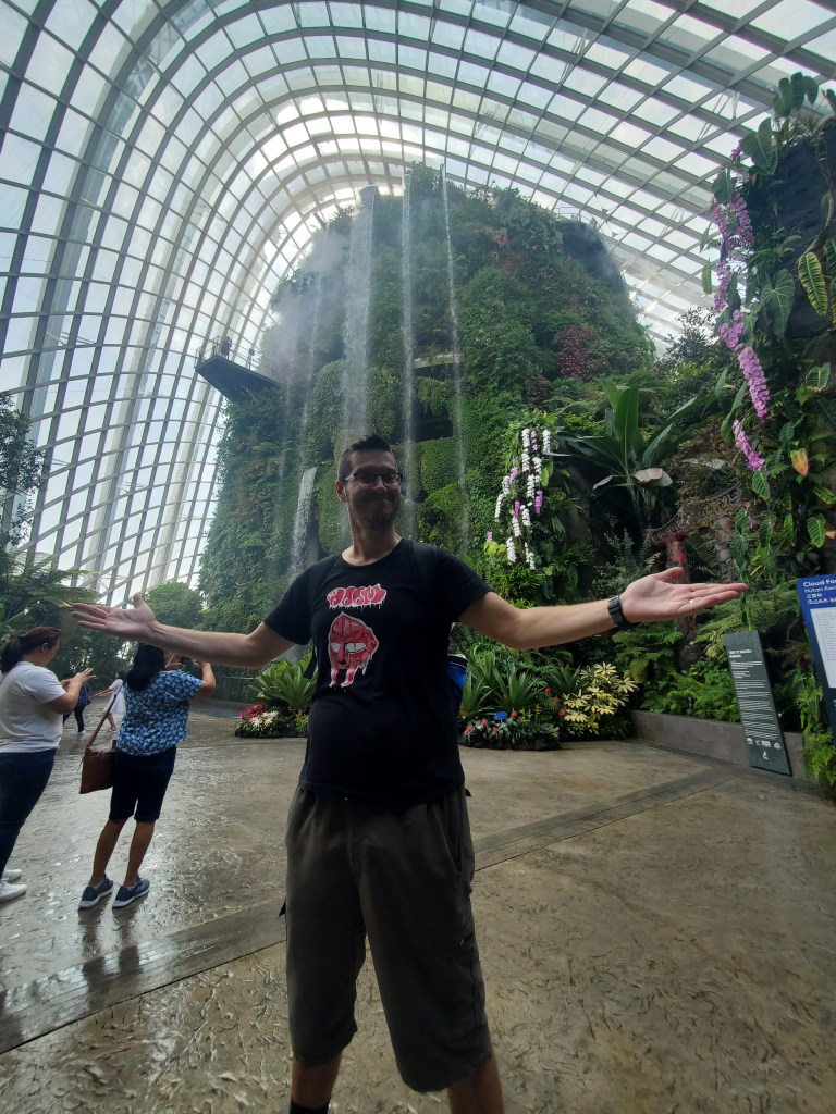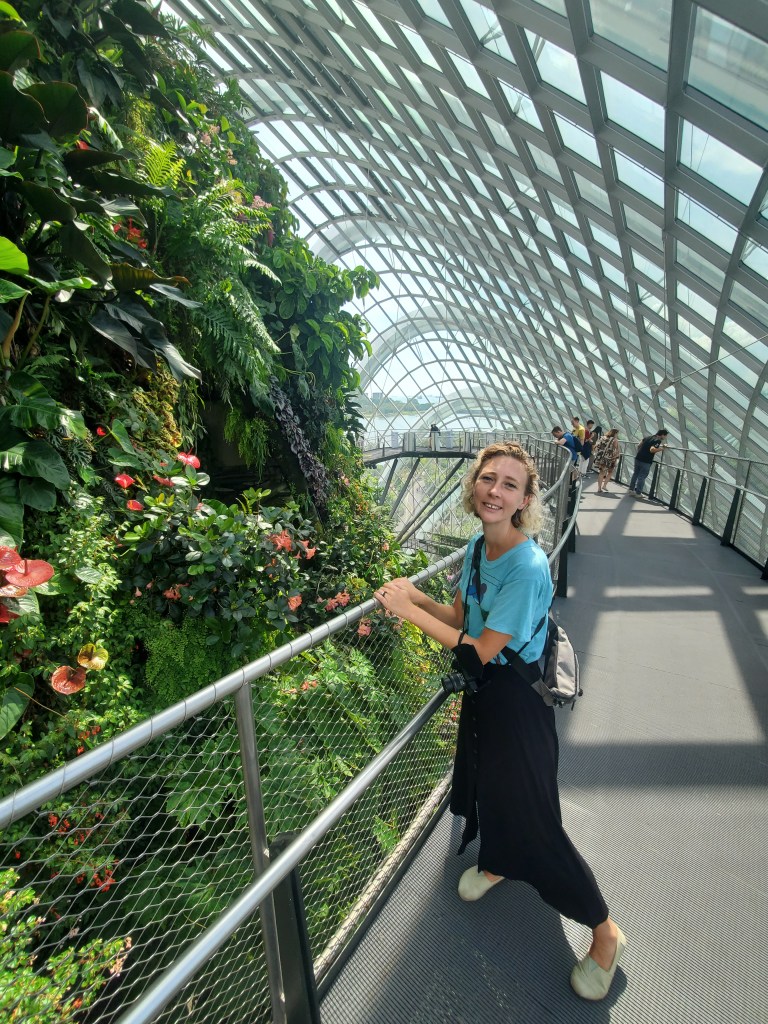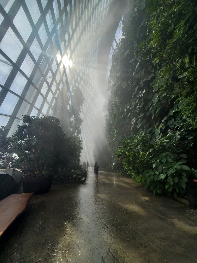 We started at the Cloud Garden, which is definitely the more popular of the two gardens. You’ve probably seen photos of the Cloud Garden online already, it’s pretty popular…it’s a huge mountain of gardens weaving up to the top of the glass greenhouse ceiling. As we walked into the greenhouse, it was watering time and the entire greenhouse was in mist and it really added to the jungle feeling of the place. I could hardly see a few metres ahead of me.