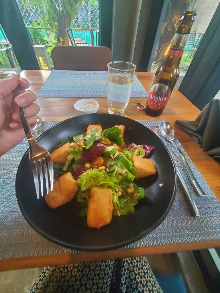 As Jives was trying to sleep and feel a bit more human, I ventured out to find food to eat on my own. I found a vegetarian place to eat nearby after about a fifteen minute walk. It felt weird to be going alone, but I had travelled a lot on my own in the past, I just prefer having a friend with me, not sick in bed all by himself. Poor guy. The place was called “Banlle Vegetarian Restaurant”. I walked in and the lady asked me “how many people?” when I said “one” she looked disappointed. She led me to a table and took the second place setting away. I ordered a stuffed tofu salad and a “traditional” Khmer curry with rice, as well as an Angkor Beer. It’s awkward eating alone, what do you stare at as you wait for your food?