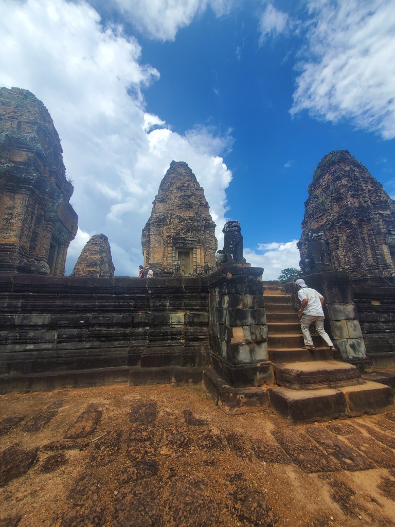 After Ta Som we headed to two pretty similar looking Hindu temples, each built long before Angkor Wat by King number two, 1100-1200 years ago. The first temple was called East Mebon temple. “Me” means man “bon” means women , so the temple is for the continuation of life and dedicated to Vishnu the Hindu god of creation. This temple had four levels that stepped up to one another. One layer had elephant sculptures on each corner. The top most layer I could go to had elaborate carving on the super ornate doorways. In the middle there was a tower leading to the last layer, but I don’t think foreigners were allowed up there and I certainly didn’t want to make anyone feel uncomfortable.
