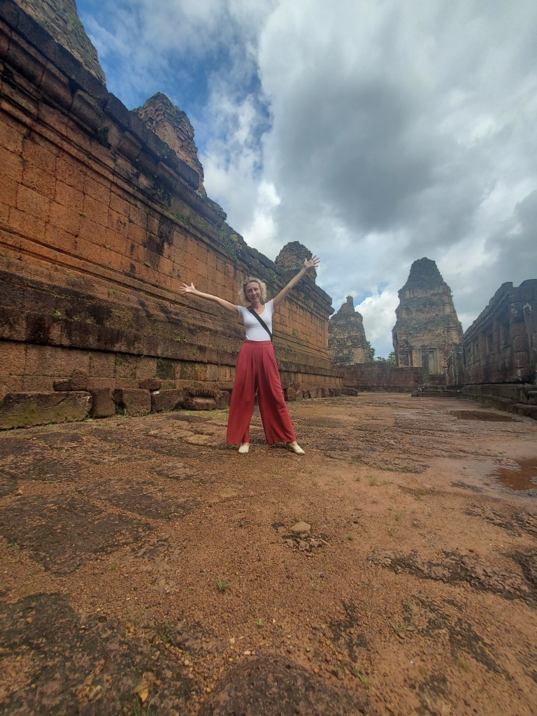I believe the last temple was called Pre Rup. Pre Rup was also built by King number two and is a Hindu temple, which I feel you can tell by the shape (but I have seen A LOT of temples in my time). It was also very old and built before Angkor Wat. The layout was similar to Mebon, but instead of walking around the steps (layers) of the temple, you could go directly to the top via a very steep set of stairs. The view from the top was very much worth the climb. You could look down to the lower layers of the temple (over a dope-stone-lion’s shoulder) and see far into the jungle. It was a beautiful last temple to explore. I tried to take some timer photos of myself… I think a few turned out alright. I was missing my camera man a lot, poor Jives sick in bed at the hotel.