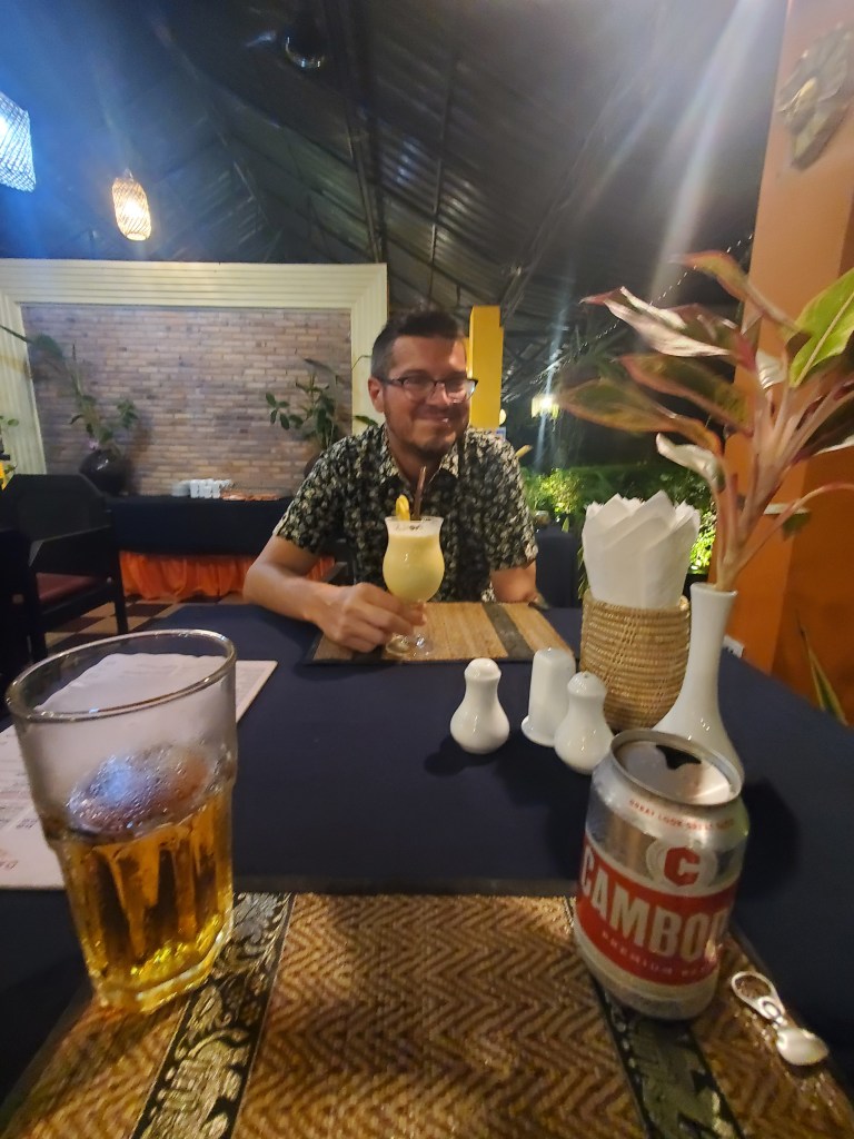 At 6:00 I convinced him to go down to our hotel restaurant to eat with me, as he had hardly had any breakfast and I was hungry too. I ordered Tom Yum spicy soup that came with rice. It was so good, sour and hot and very lemony with big chunks of tomato. Jives got fried rice which he had a bit of. I ended up finishing most of it. I had two small cans of Cambodia beer and Jives ordered a “Bayon” drink with pineapple, line and egg I think? He also got a lime juice. The whole meal was $17, pretty good! Ahh Cambodia is so nice on the wallet after Singpore., especially when it comes to beer.