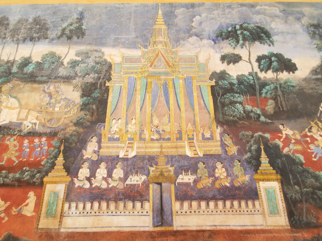 We walked down the corridor that divided the palace from the silver pagoda. The passage was lined with flowers and bushes. We then turned left and entered a large courtyard where the silver pagoda and many stupas were. The entire way around the courtyard the walls were covered in colourful murals depicting stories. We investigated these murals for quite awhile and then went to look at the elaborate carved stupas.