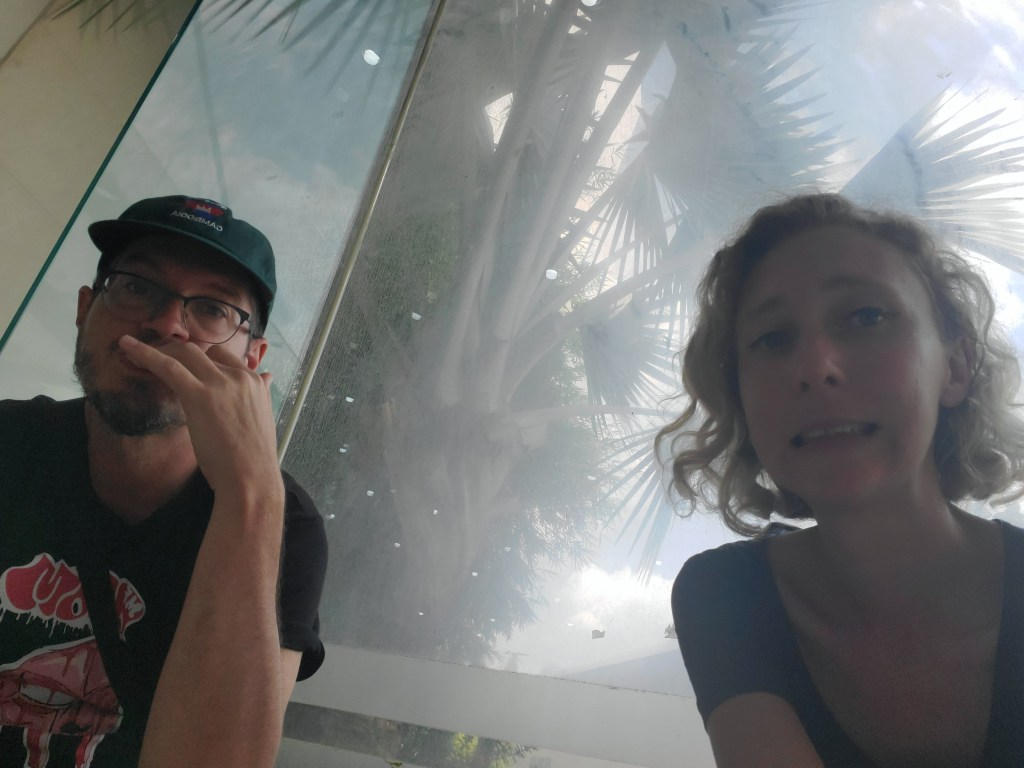 We drove a few hours before stopping for ten minutes at a roadside stop to have a washroom break. We then continued to the Cambodian border, which took about 4.5 hours. We got off the bus with our passports. Jives went first. The border guard checked our passport photos against our visas and then we stood awkwardly . The lady from Giant Ibis (the bus company) told us to go to the “last counter” so we wandered down to the end of the covered area. Being first was a bit awkward. Eventually the one bus driver yelled over to me to go where he was, so I did…and everyone followed me. The bus company lady then collected our passports to go and get them stamped out of Cambodia. We then hopped back on the bus and the one driver took us to the duty free where we had a thirty minute break for lunch.