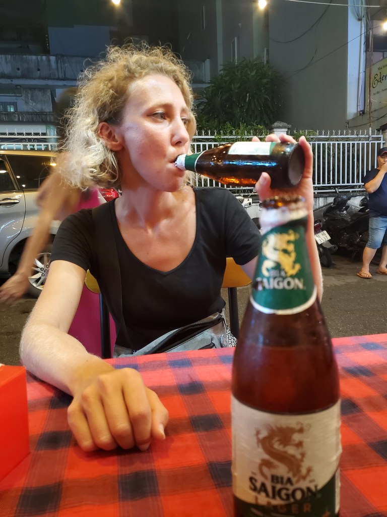 We found our Airbnb entrance by a series of pictures and walked up two floors of a very local looking building. The room was very nice with an amazing view of the night life down below. We got unpacked and situated, resting for a bit before heading out to a place nearby for dinner. We walked once again through 23 September park and down a smaller side street which was lined with little restaurants. We chose one because it advertised vegetarian food. I ordered a veggie curry with potato, onion, carrot and fish, while Jives ordered a fried tofu and tomato dish. Both dishes came with rice, and we ordered a green Saigon beer to share. The food was lovely and we loved sitting at the edge of the road. We had a really great time, until it came time to pay. A lady who had not previously served us stormed over with our bill. The total was 219,000. I gave her 300,000 as this was our first purchase in Vietnam and I didn’t have much in the way of small bills (for perspective 100,000 is equal to about $4). The lady refused to give us change for the bill yelling “give me” and grabbing money out of my wallet herself. The restaurant was pretty full, there is no way she couldn’t give us change. The lady grabbed the bills she wanted out of my wallet and stormed away. The staff was all looking at me…I walked away. The nice guy who had served us said “ please come back again”. The pity was I really wanted to go back for breakfast the next day, Jives and I had even talked about what we were going to order…