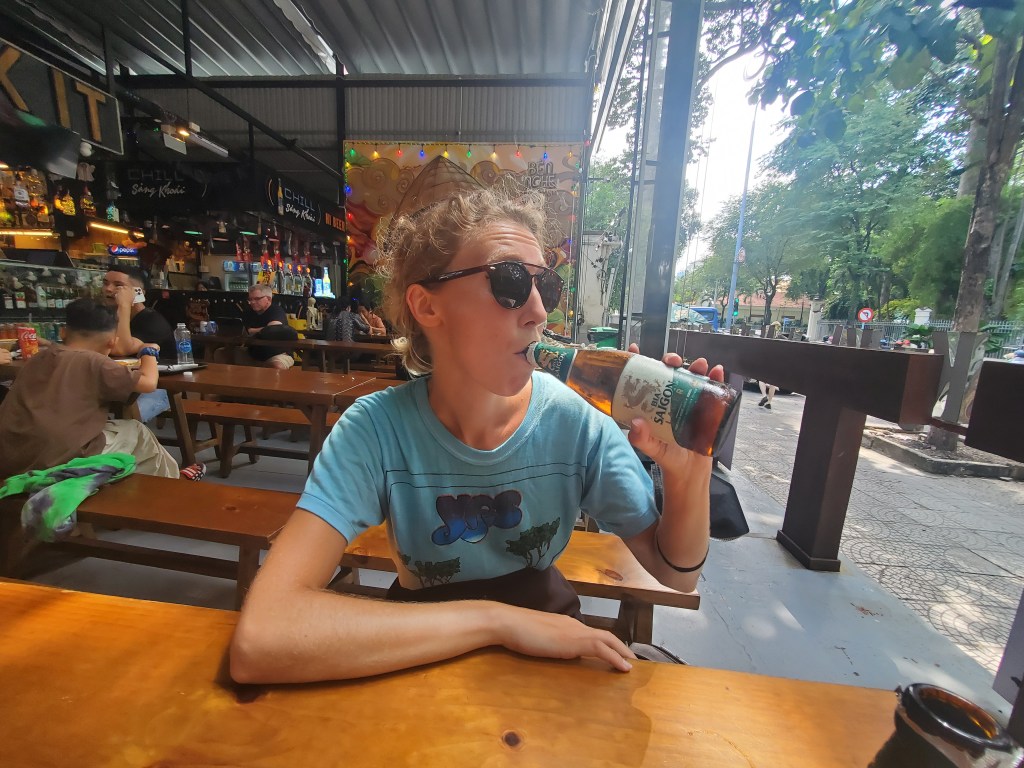 We then crossed the road and had a beer at the little night market looking area that we had gone to to escape the rain the day before, as it was the hottest day we had had so far in Vietnam and we needed to escape the heat. Afterward we walked to a craft brewery called “Heart of Darkness” on our way to Little Japan. We ordered two craft beers, a lemongrass ale and an IPA. We also got food, Jives got vegetarian tacos and I got a falafel burger with fries. It was delicious! We kept making these little stops to try and avoid the rain, but the rain kept holding off.