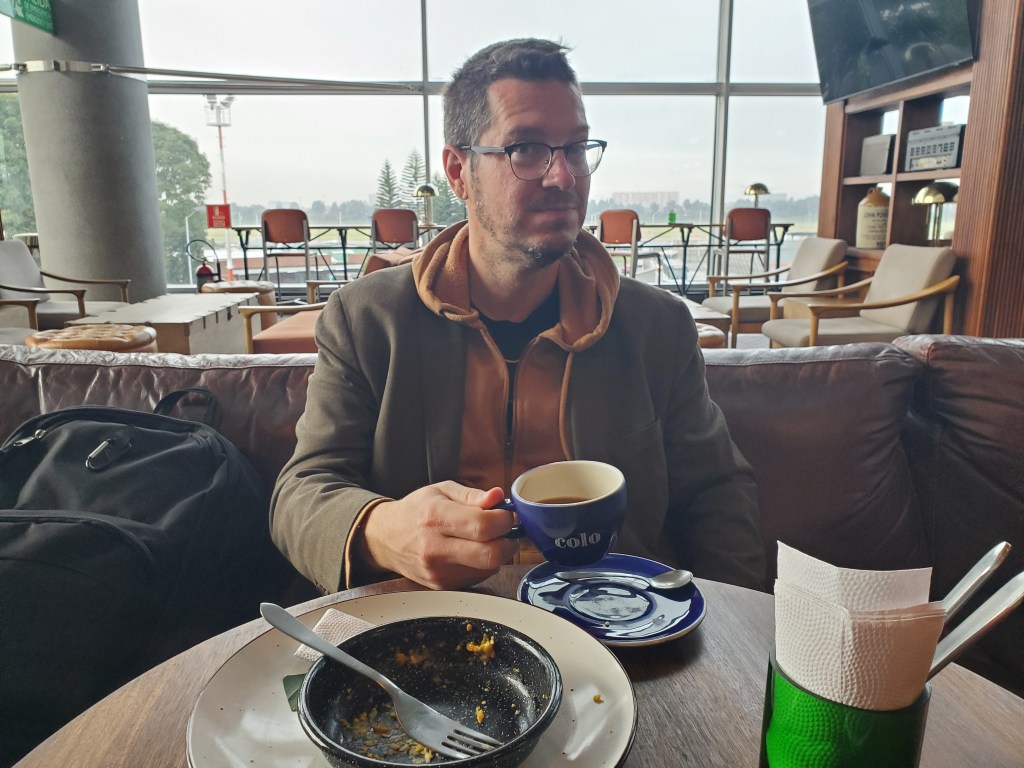 We woke up at 4am and had a quick coffee before some last minute packing and route checking. We checked out at around 5:00am and walked down the dark streets to Parque de Hippies where we waited for the first bus to the airport (M86 or K86) for our flight at 8:45am. The bus arrived at 6:00am, and we got on an already pretty busy bus (it would get MUCH fuller). The bus ride took about an hour and it was so packed at one point that the air was pushed out of my lungs and I thought I might be crushed to death against a window. We arrived at the airport around 7:00am. The walk to our security area was long, but security took a matter of minutes and we were through to the gates. We chose a restaurant to have some breakfast and coffee at and ordered eggs with tomato and a corn like bread ball to dip on it. It was pretty good for airport food.