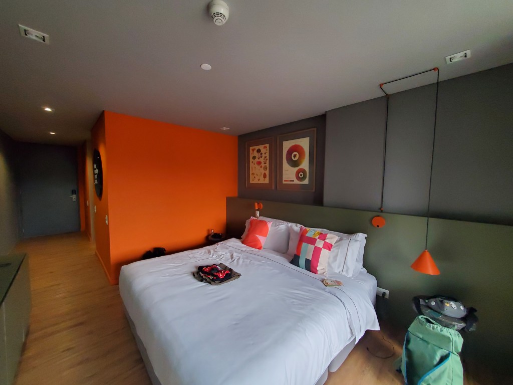 We then went to our room which was on the 8th floor overlooking both the city and the mountains with a big balcony that opened up onto the room. The room was decorated with retro green and orange and had posters of mushrooms and the colour wheel.
