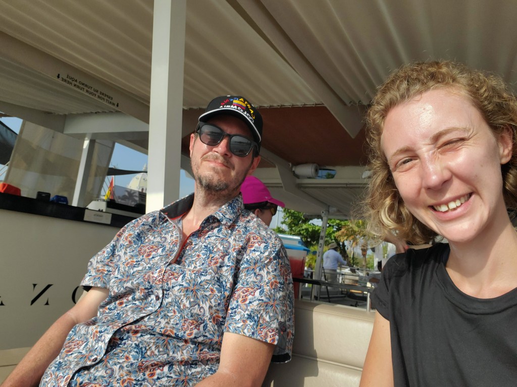 We set our alarm for 6:00am as we had a tour leaving from the harbour at 8:00am. The harbour was about a 45- 50 minute walk from our hotel. We ended up leaving the room at 7:00am and walking through the old town and making it to Pier 3 with 10 minutes to spare. I guess we were walking slowly this morning. A few weeks before I had booked a tour of the Rosario Islands on Tripadvisor. I had never booked a tour through Tripadvisor before, but it worked out pretty well. The Rosario Islands are a protected natural park because they contain very important ecological coral reefs, mangroves and seaweed beds. In the 1980’s it was incredibly dangerous to go to these islands as Escobar had a mansion on one of the islands, which has now been reclaimed by nature. We entered the Pier area and boarded the catamaran , “Bona Vida”. It was a huge solar/wind powered catamaran! We grabbed a welcome watermelon drink and sat in the sun. The boat took a while before it left the port for the Rosario Islands.