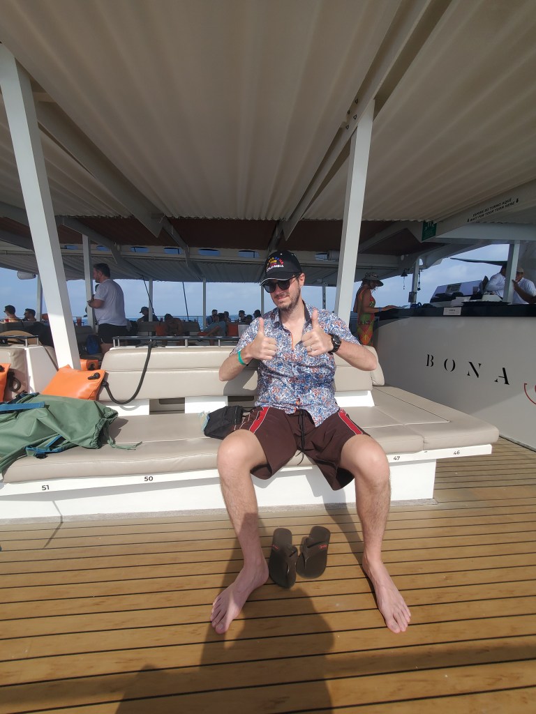 After one and a half hours of sailing we reached our first stop. I don’t know where in the islands we were, but it was a small bay and we were quite a ways from shore. You could borrow snorkels, pool noodles etc but you had to give them an I.D to hold in exchange. We hadn’t brought I.D on the boat, so JIves went without a snorkel. I however am a fish at heart and always travel with my own snorkel. We got in the lovely clear and warm Caribbean water and swam about. There really was nothing to see with my snorkel anyways (the water was very choppy) so Jives wasn’t missing much. I have heard there is incredible snorkeling around the Rosario Islands, but clearly this was not the spot. It was still lovely. We took turns jumping off the catamaran and filming it. We were stopped at this first spot for about an hour and a half. Guys on kayaks paddled over to the boat to sell drinks and mussels off of their kayaks.