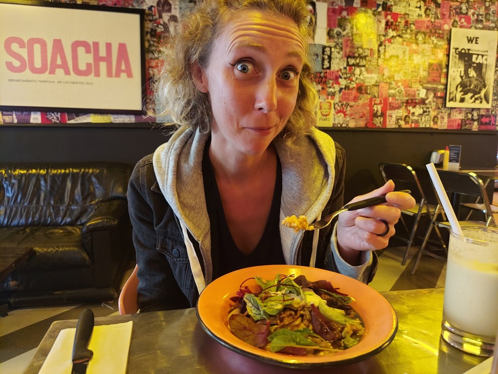 We headed out a few hours later to visit a park nearby called “La Veja” I think… It was a beautiful little retreat in the city, with pathways made of sliced logs of wood. It was a bit of a climb to see the park, but it was along a lovely stream with many waterfalls. There was a wide variety of plants and so many flowering varieties. There were also signs throughout the park illustrating the types of flora and all the bird varieties that live there as well. After thoroughly enjoying the park we walked back down to the main road where we decided to have dinner at a vegan restaurant called “Elektra Punk and Food”. I ordered the “soupy rice” which was like a mushroom risotto, and Jives got a pizza. The waiter suggested I get a milkshake with guava and mango. Everything was amazing! My soupy rice was the best food I had on the whole trip. The rice was in a green broth with an assortment of mushrooms and onion and some greens. The flavour was so rich, and it was like comfort food. So so amazing. The total came to 101,000.