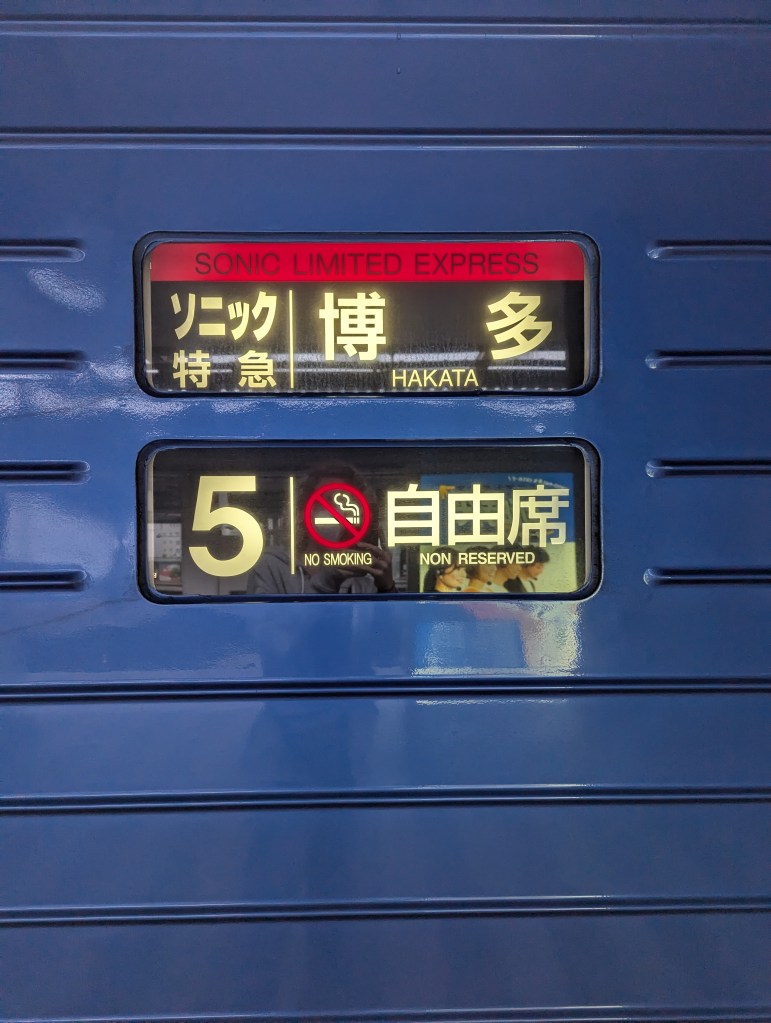 I washed and went to sit in the indoor bath for quite awhile, as the ladies outside talked. When the ladies finally left, I went and sat in the outdoor bath which was much warmer. Both the indoor and outdoor baths were much larger than at the last hotel in Miyazaki. So far the baths in Oita have been my favourite of the trip. I then tried out the small barrel bath which was filled with milk mineral rich water. As you get into the barrel the mass of your body displaces so much of the water over the top of the barrel. The water was lovely and warm. After soaking in there I rinsed off, dried and went to sit in the manga room with the vending machines for post onsen milk drinks. I caught up quite a bit on my journal writing and waited for the boys to wake up. Jives joined me at around 7:30am. We set out on our day’s adventure at 8:30am. First we headed to Detour restaurant nearby for breakfast. I got coffee and a hot tuna melt. We then headed to the JR station to reserve seats on the train to Aso the following morning. We put some more money on our Suica cards and then headed to the platform to catch the Sonic Express train to Beppu. The train ride was only 8 minutes long!! The train was old-timey, maybe early 60’s? With metal seats and wooden floors.