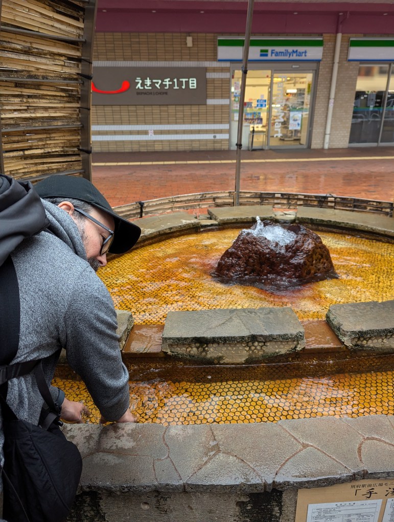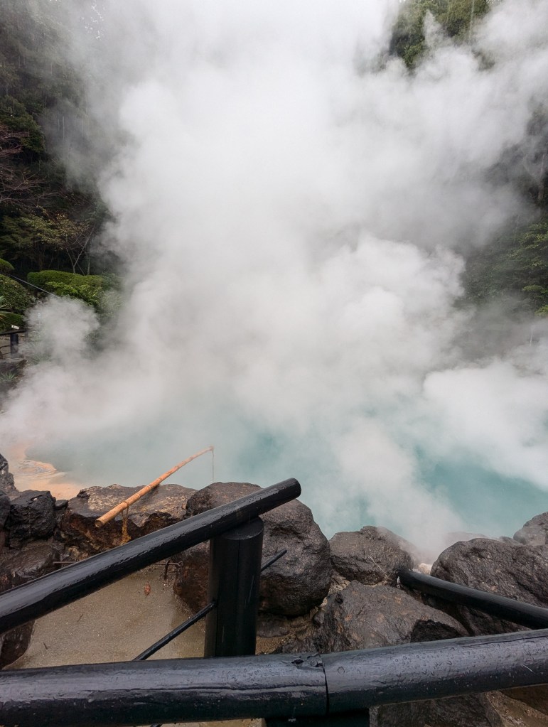 We then visited our second hell, arguably my favourite one Kamado Jigoku or the “Cooking Pot Hell”. The hot spring had a huge footbath where Jives and I sat on wooden benches over blue water and soaked our feet. There was a section that was super hot and the bottom of the bath had sand. A nice Japanese man and his son beckoned me to sit with them in the hot section with the sandy bottom. We squished our toes in the sandy gravel. This foot bath was so warm! The nice Japanese man offered to take a photo of us! You could get steamed eggs, corn and potatoes here to eat. There were quite a few small ponds of hotspring on the grounds as well, and large pools of mud bubbling up. There was also a place where it was suggested to “suck the steam” from a spout shaped like an oni’s mouth.