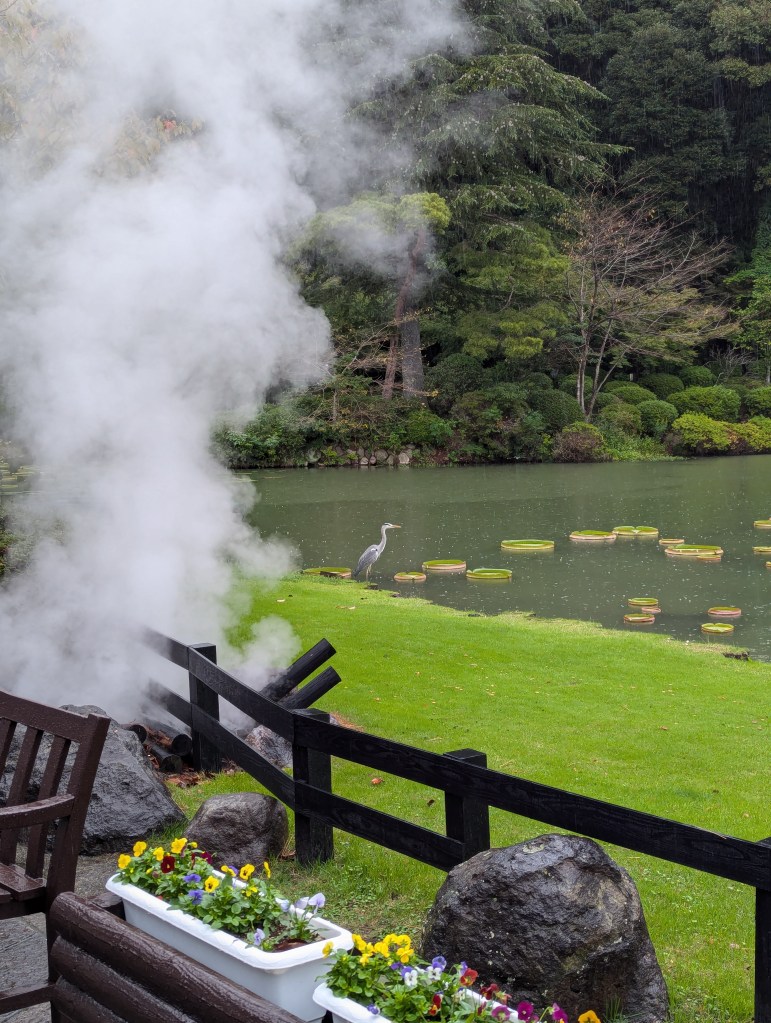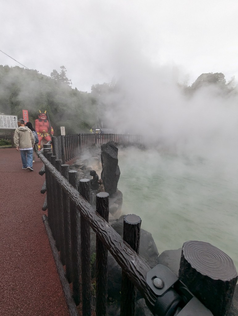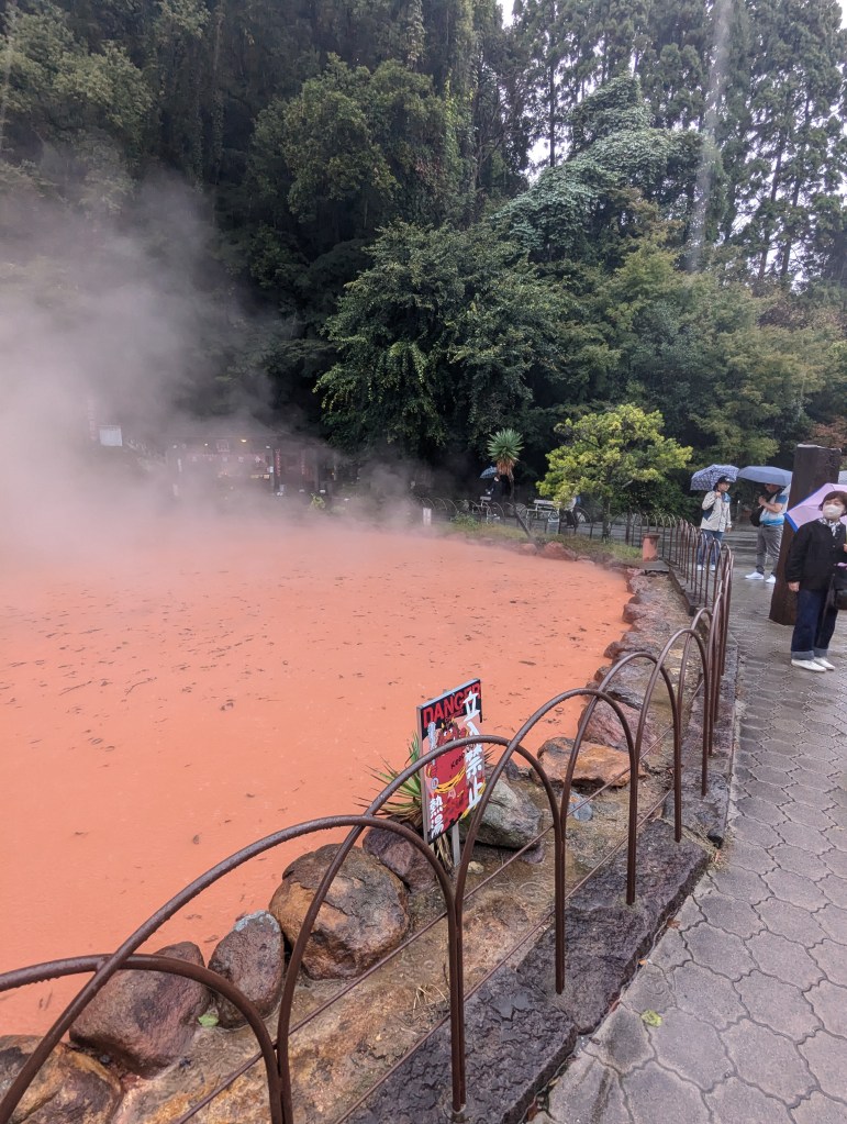 The third hell we visited was Umi Jigoku or the “Sea Hell”. The grounds of this hell were huge. First we saw a giant pond with lotus flowers and herons and the giant kind of lily pads that could probably hold the weight of a large child. Next we walked through a small gift shop where we bought an umbrella to share, as it was raining quite hard. I also bought a jar of spicy yuzu paste (a citrus fruit) and we purchased a drink that we tried outside on the picnic tables under an awning, as we waited out the crazy rain. We didn’t know where Hairth went… so we sat and tried to spot him. Apparently he had slipped a few times and decided to leave Umi Jigoku.