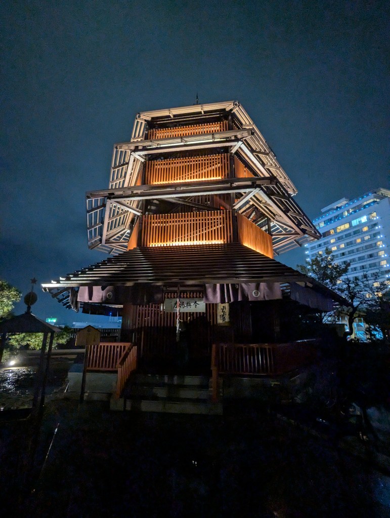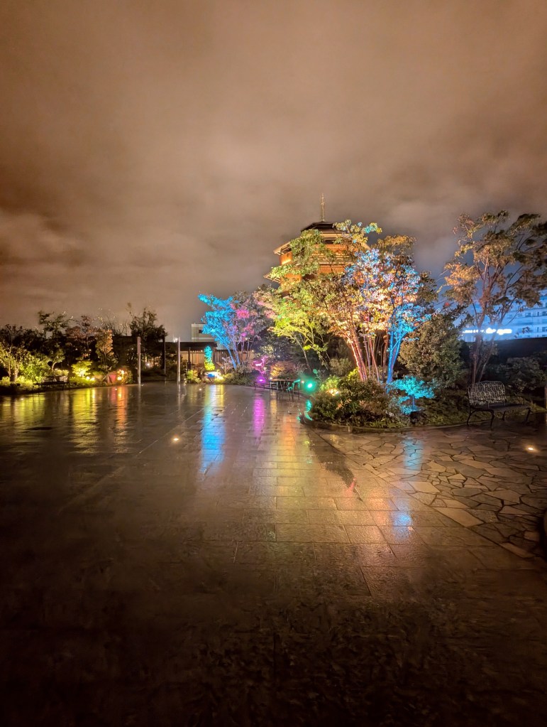 We then went up to the mall roof top to investigate a shrine and light display we had seen from afar. It was pretty magical all lit up in the rainy puddles, the reflections were beautiful.