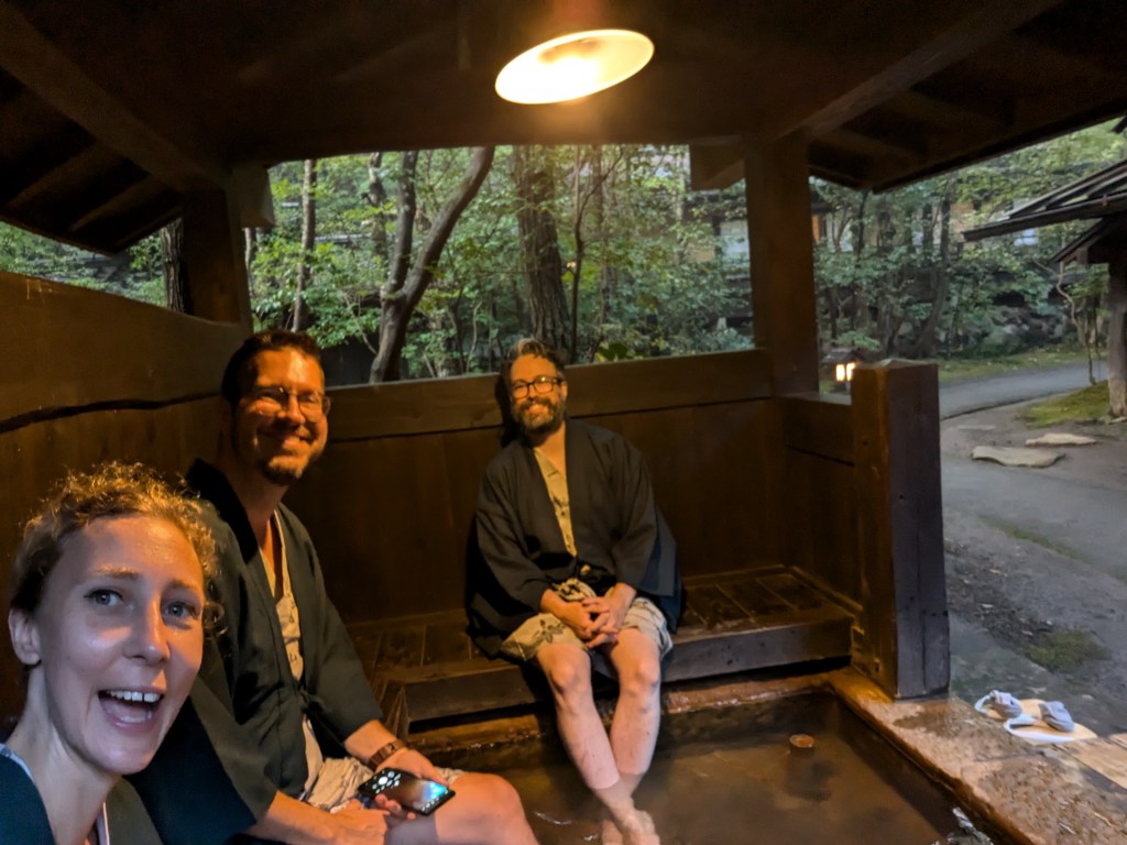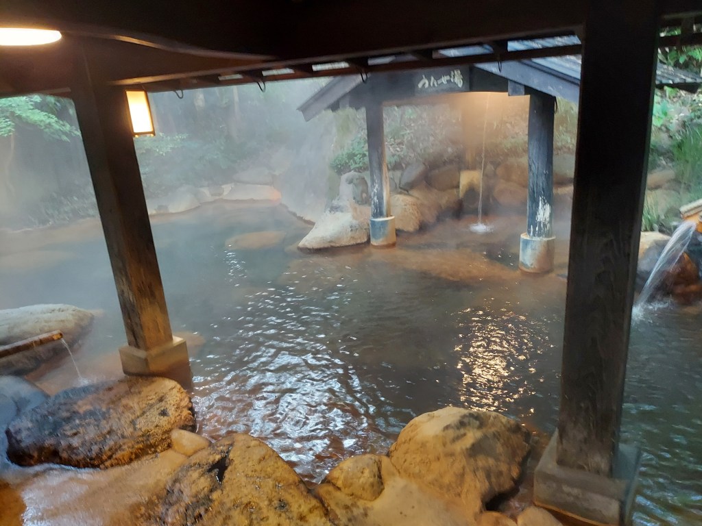 After dinner we tried to walk to a nearby corner store with a cat, but the roadway was closed. We headed to the baths instead! The outdoor bath closed at 10pm so we went there first. There were two outdoor baths, one for women and the other was mixed, but I assume mostly men use that one. I entered the women’s outdoor bath and there was no one there!!! The bath could have easily accommodated 40 people, it was huge (a bit bigger than the men’s bath).I deposited my stuff in a basket and then rinsed off my body with the small bucket provided beside a small barrel of water. I then got in the bath. My experience with other outdoor baths is that they are often very cold, but this one was hot!! The closer to the spout you get, obviously the hotter it was. There were two covered areas to sit in, in case it was raining. Huge rocks dotted the outer edge of the bath and even in the middle, so you could sit like a mermaid on a rock if you wished, in order to cool down. There was even a view down to the loud rushing river! I soaked for a long time and no one came in the entire time I was there. I tried sitting in many different spots. I then dried off and waited for the boys outside the bath.