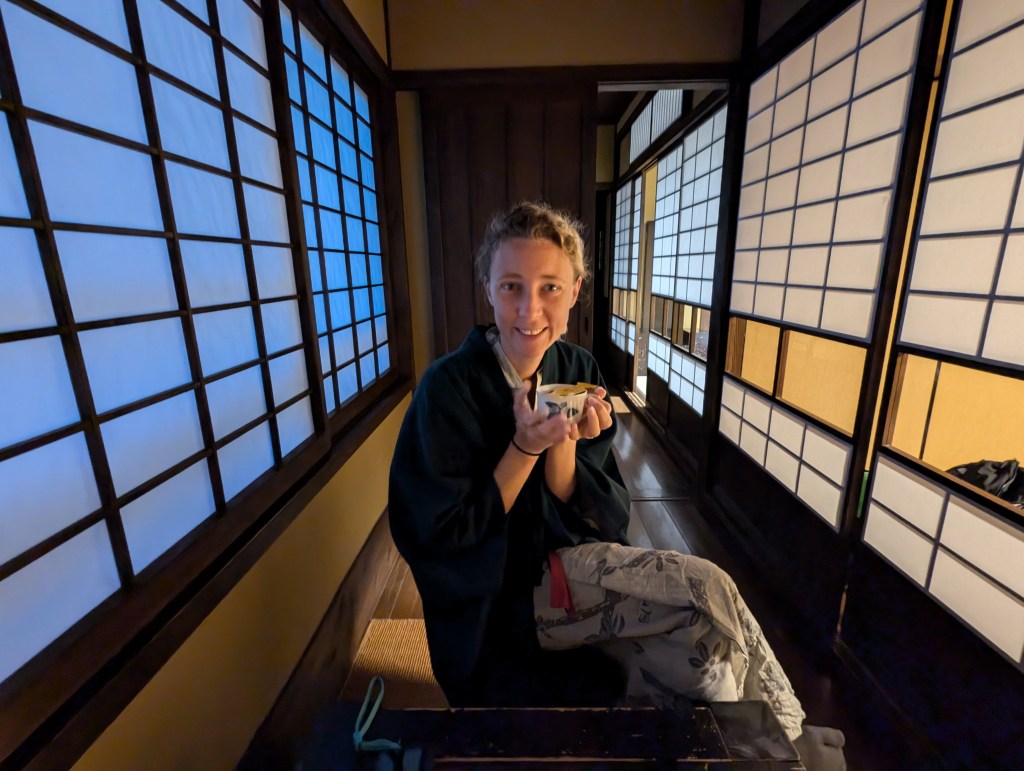 We arrived at the ryokan and we were welcomed with tea and red bean mochi. We then filled out a form and were told about the baths (outdoor and indoor) as well as the meal time. We then were given a key and walked to our room.