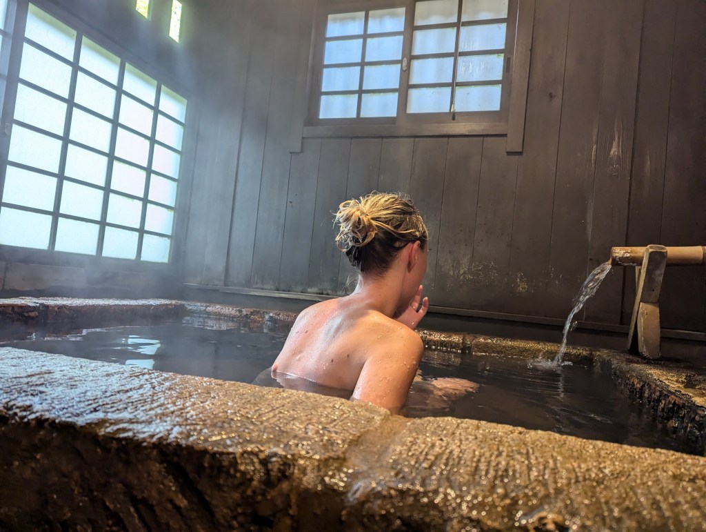 Jives and I then decided to  go to the indoor bath. I entered the changeroom and there was one older lady in the room, trying to use the hairdryer. She asked me if I knew how to work it. I said sorry, as I did not know… I then looked confused and tried to figure out which door went to the bath. The lady showed me the correct door and said “oyasumi” or goodnight as she left. I entered the bath and once again it was empty. I washed at the little wash station and then entered the bath. This bath was much smaller and much colder. The bath was maybe 6 feet by 6 feet total. I soaked here for a while before getting out. I met Jives outside, perfect timing!